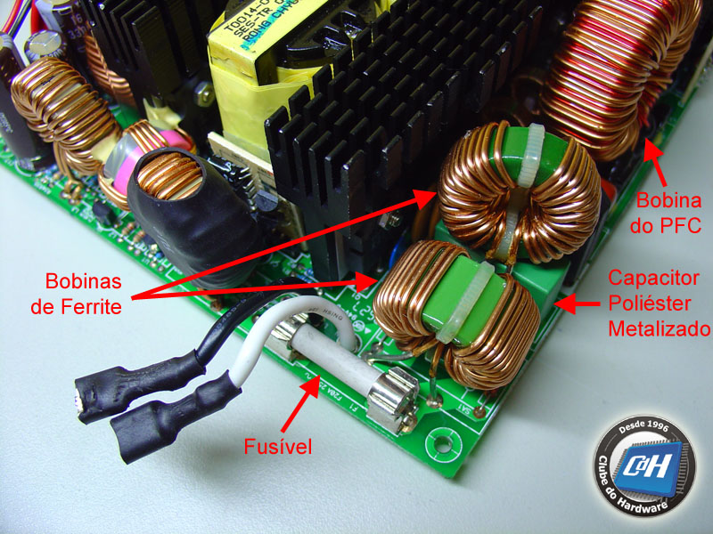 Como já dissemos em outros artigos, a primeira coisa que gostamos de ver quando abrimos uma fonte de alimentação para termos uma ideia da sua qualidade é o estágio de filtragem de transientes. Em fontes de alimentação genéricas este estágio tem apenas uma bobina, dois capacitores cerâmicos, um ou dois capacitores de poliéster metalizados e, se tivermos sorte, um varistor (MOV).
