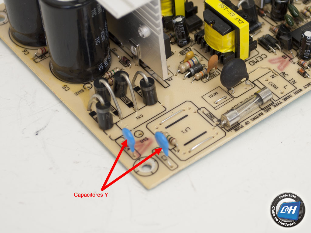 Esta fonte de alimentação tem apenas dois capacitores Y em seu estágio de filtragem de transientes. Lembramos que este estágio serve não só para impedir interferências e picos de energia de entrarem na fonte de alimentação, mas também para impedir que a interferência eletromagnética gerada pela fonte retorne à rede elétrica.