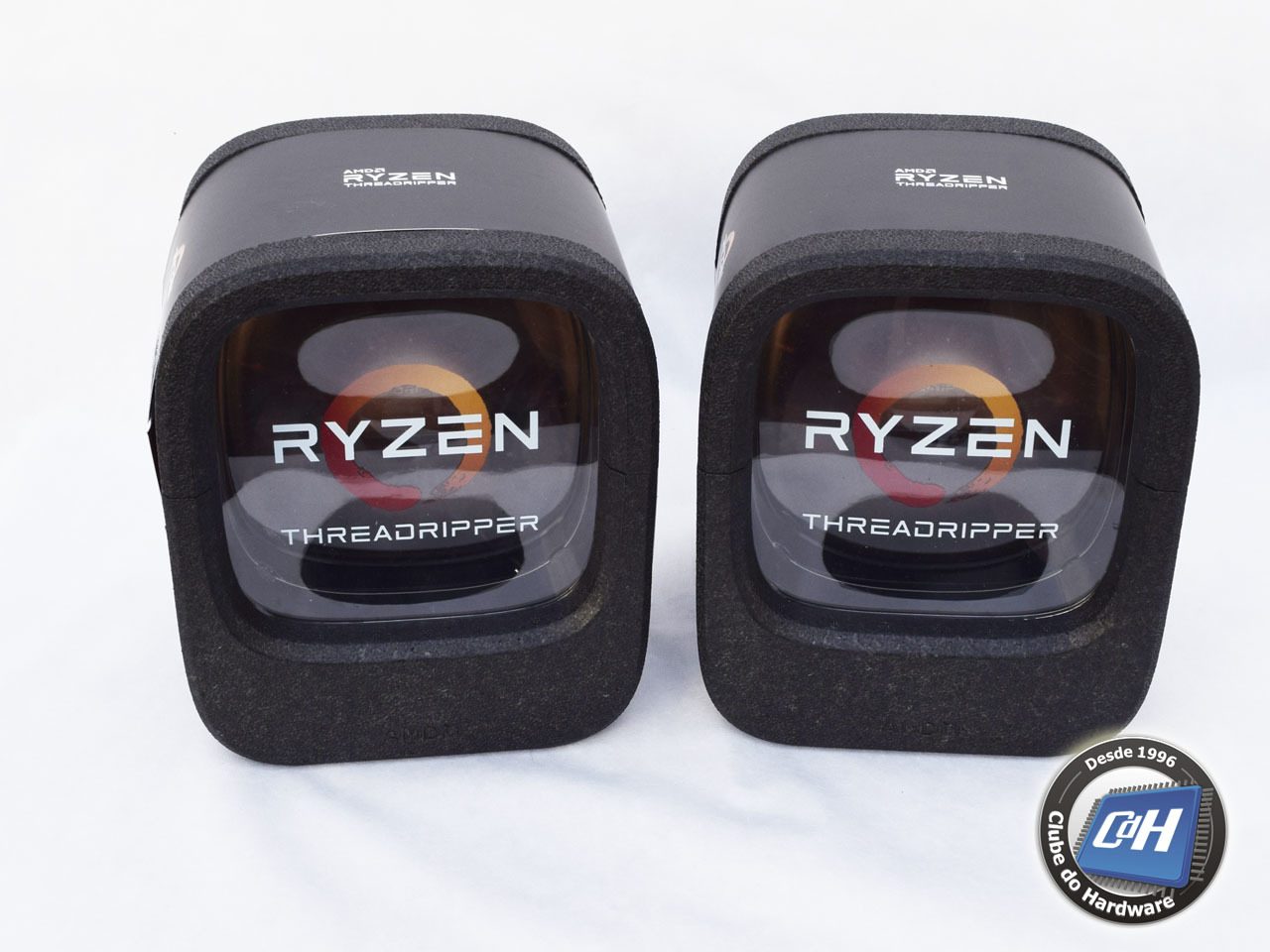 Na Figura 1 vemos a embalagem do Ryzen Threadripper 1920X, ao lado da de seu irmão 1950X. Trata-se de uma enorme embalagem de espuma.