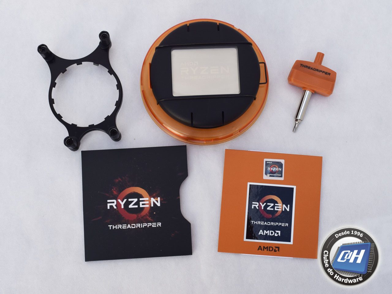 A Figura 2 mostra o conteúdo da embalagem: uma segunda embalagem plástica onde fica o processador, um suporte compatível com vários modelos de sistema de refrigeração líquida, uma chave Torx para instalação do processador, dois adesivos e um pequeno manual.