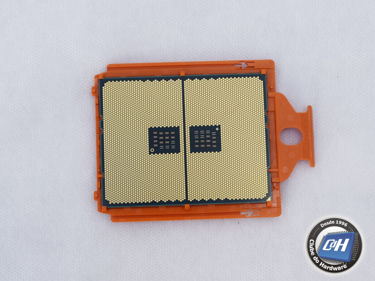A Figura 4 mostra a parte inferior do processador. Note que, neste processador, a AMD adotou o sistema LGA (semelhante ao utilizado nos processadores da Intel), onde os pinos ficam no soquete e não no processador.