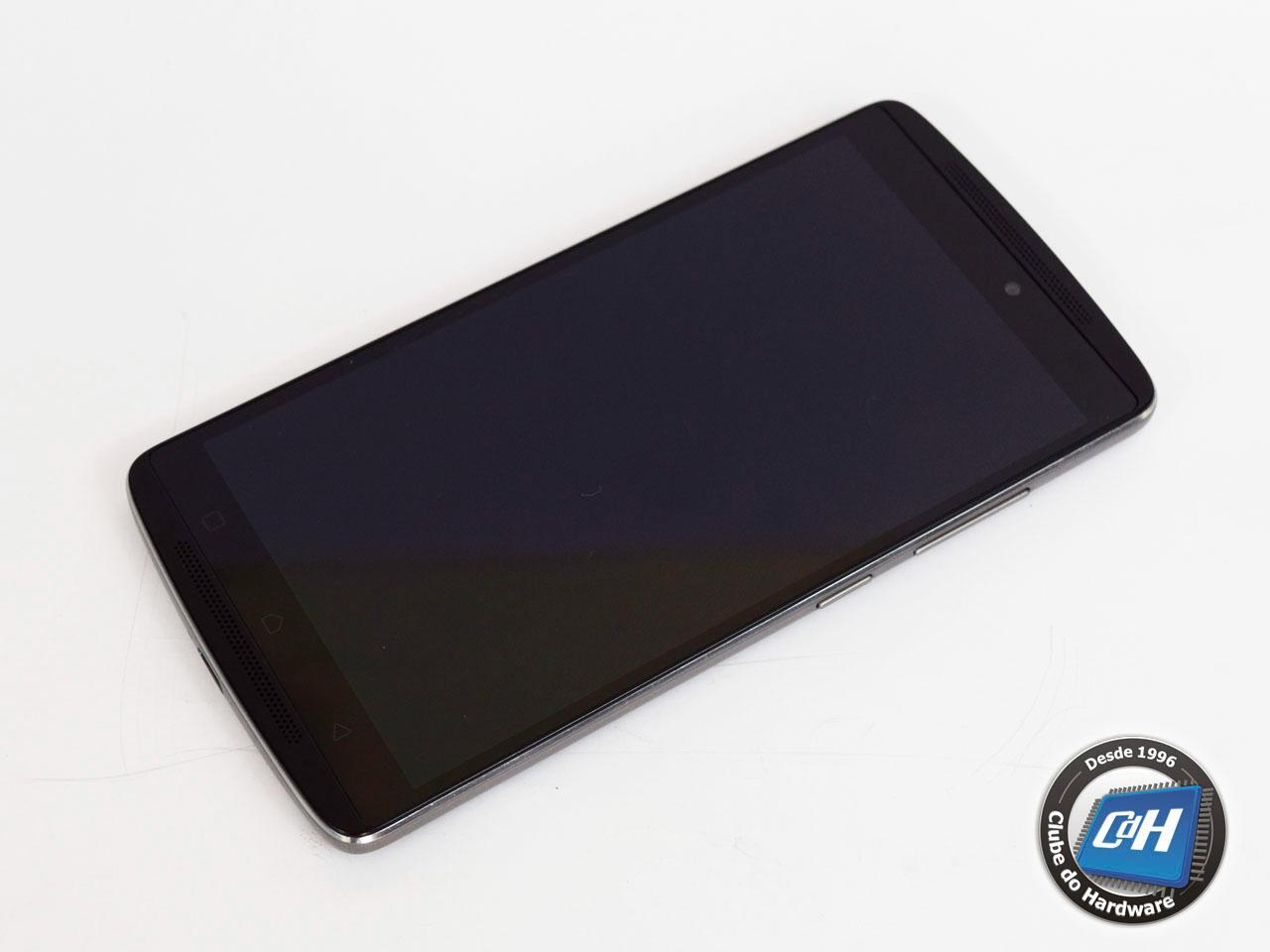 A Figura 3 revela a frente do Vibe. A câmera frontal fica na parte de cima, e há dois alto-falantes, um em cada extremidade. Os botões típicos do sistema operacional são sensíveis ao toque e ficam abaixo da tela. As bordas são de metal.