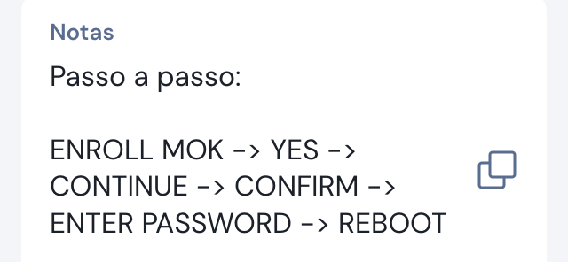 No Debian quando está instalando o SO com o secureboot ativado o instalador pede para criar uma senha, após finalizar a instalação e reboot pela primeira vez vai direto para uma tela azul (MOK), é preciso inserir a mesma senha que foi criada durante o processo de instalação, esse procedimento é obrigatório e serve para assinar as keys do SB 👇