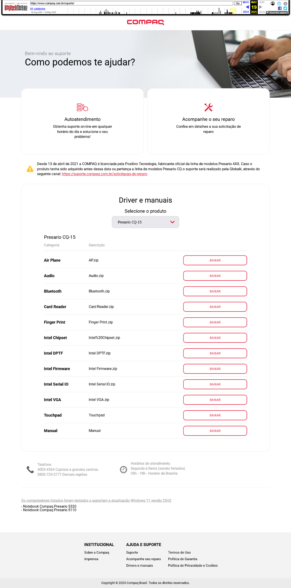 https://web.archive.org/web/20250519021227/https://www.compaq.com.br/suporte/ (Selecione "Presario CQ-15, vide anexo)