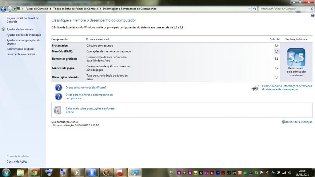 Outra coisa é que o processador é MUITO bruto, o que te dá impressão de ser pior é devido a HD de 5400RPM e memórias. Aqui no meu desktop, as memórias são muito melhores e o HD, apesar de não ser SSD, tem 7200RPM. Para ilustrar em números, a memória aqui no desktop fica com 7,6 pontos na pontuação do windows 7, e o notebook fica em 5,9. Já o HD, tem 1 ponto a menos, 5,8 no teste, e sinceramente não sei porque, mas a diferença de RPM muda bastante. Processador tem tão pouca influencia na abertura de programas, que um core2duo com um bom SSD é capaz de ser umas 10x mais rápido do que esse i7 nesse sentido.