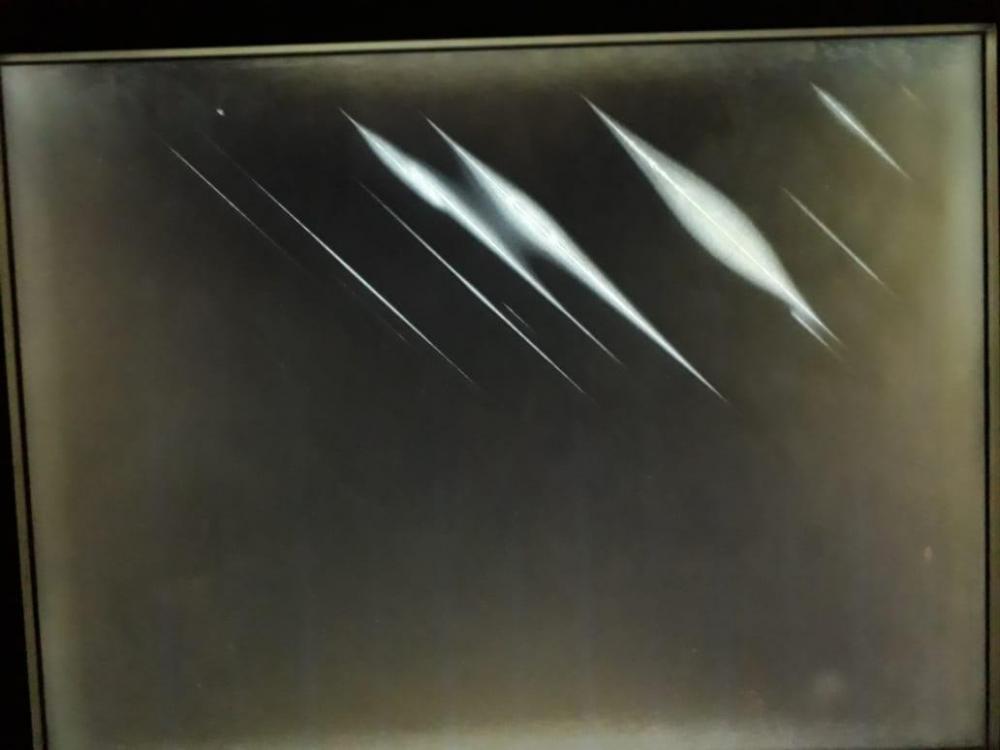 Apareceu a primeira marca há algumas semanas, não sei dizer precisamente quando, mas começou com uma linha branca na diagonal e com o passar do tempo foi aumentando ao mesmo passo que outras surgiram também. Detalhe que todas seguem exatamente a mesma orientação diagonal, e se assemelham a uma especie de rasgo. Monitor Samsung SyncMaster 540n