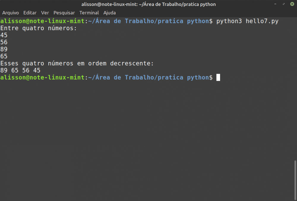 Boa tarde Eu fiz um programa que lê quatro números e imprime eles em ordem decrescente: Porém eu gostaria que ele me retornasse o número da linha em que o programa foi finalizado, da mesma forma que o interpretador faz quando ele encontra algum erro: Segue o código do programa: print('Entre quatro números: ') a = int(input()) b = int(input()) c = int(input()) d = int(input()) print('Esses quatro números em ordem decrescente: ') if a>b: if a>c: if a>d: if b>c: if b>d: if c>d: print(a,b,c,d) else: print(a,b,d,c) else: print(a,d,b,c) elif c>d: if d>b: print(a,c,d,b) else: print(a,c,b,d) elif b>c: print(d,a,b,c) else: print(d,a,c,b) elif c>d: if a>d: if b>d: print(c,a,b,d) else: print(c,a,d,b) else: print(c,d,a,b) else: print(d,c,a,b) elif b>c: if b>d: if a>c: if a>d: if c>d: print(b,a,c,d) else: print(b,a,d,c) else: print(b,d,a,c) elif c>d: if a>d: print(b,c,a,d) else: print(b,c,d,a) else: print(b,d,c,a) elif a>c: print(d,b,a,c) else: print(d,b,c,a) elif c>d: if b>d: if a>d: print(c,b,a,d) else: print(c,b,d,a) else: print(c,d,b,a) else: if b>c: print(d,b,c,a) else: print(d,c,b,a) Olá, Logo após publicar o tópico eu encontrei uma solução bastante óbvia, simplesmente adicionar um print em todas as condições: print('Entre quatro números: ') a = int(input()) b = int(input()) c = int(input()) d = int(input()) print('Esses quatro números em ordem decrescente: ') if a>b: if a>c: if a>d: if b>c: if b>d: if c>d: print(a,b,c,d) print('Caso da linha 15') else: print(a,b,d,c) print('Caso da linha 18') else: print(a,d,b,c) print('Caso da linha 21') elif c>d: if d>b: print(a,c,d,b) print('Caso da linha 25') else: print(a,c,b,d) print('Caso da linha 28') elif b>c: print(d,a,b,c) print('Caso da linha 31') else: print(d,a,c,b) print('Caso da linha 34') elif c>d: if a>d: if b>d: print(c,a,b,d) print('Caso da linha 39') else: print(c,a,d,b) print('Caso da linha 42') else: print(c,d,a,b) print('Caso da linha 45') else: print(d,c,a,b) print('Caso da linha 48') elif b>c: if b>d: if a>c: if a>d: if c>d: print(b,a,c,d) print('Caso da linha 55') else: print(b,a,d,c) print('Caso da linha 58') else: print(b,d,a,c) print('Caso da linha 61') elif c>d: if a>d: print(b,c,a,d) print('Caso da linha 65') else: print(b,c,d,a) print('Caso da linha 68') else: print(b,d,c,a) print('Caso da linha 71') elif a>c: print(d,b,a,c) print('Caso da linha 74') else: print(d,b,c,a) print('Caso da linha 77') elif c>d: if b>d: if a>d: print(c,b,a,d) print('Caso da linha 83') else: print(c,b,d,a) print('Caso da linha 86') else: print(c,d,b,a) print('Caso da linha 88') else: if b>c: print(d,b,c,a) print('Caso da linha 92') else: print(d,c,b,a) print('Caso da linha 95')-