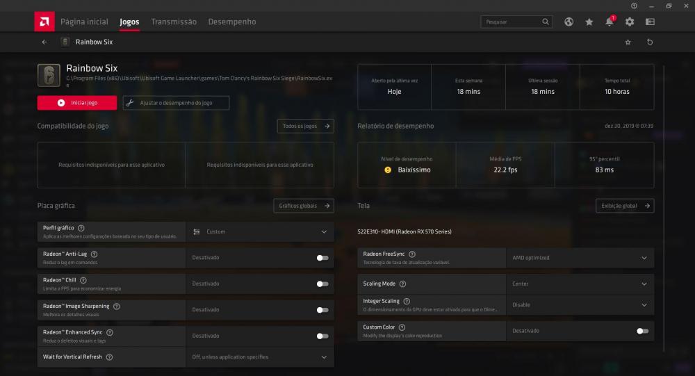 9. Boa Noite, galera! Caso esse assunto não seja deste tópico, eu peço desculpas e peço que o removam ao lugar certo por gentileza. Tem uma semana mais ou menos que meu Rainbow Six começou a dar problemas, no MENU do jogo, fica um lag absurdo, caindo pra 15/20/30 fps, e na partida, fica normal, 100/140 fps, sem apresentar nenhum lag, no aplicativo da Radeon, consta um uso de 100% da GPU no game, e queria entender o motivo de estar acontecendo isso, ou algo que possa estar influenciando. Uso todos os gráficos no LOW, in-game roda liso, mas no MENU fica dando lag e caindo FPS Segue as configs do meu pc: Processador: Ryzen 5 1600 Six-Core Placa de Vídeo: Radeon 570 4GB Memória RAM: 8GB Armazenamento: 1TB HD e 240SSD Placa-mãe: Biostar Racing 350GT3 Fonte: Pcyes 450W