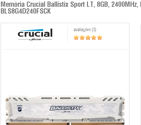 10. Boa tarde, galera! Caso esse assunto não seja deste tópico, eu peço desculpas e peço que o removam ao lugar certo por gentileza. Tenho um computador cuja as configurações são essas: Processador: Ryzen 5 1600 Six-Core Placa de Vídeo: Radeon 570 4GB Memória RAM: 8GB Armazenamento: 1TB HD e 240SSD Placa-mãe: Biostar Racing 350GT3 Fonte: Pcyes 450W ou 500W Recentemente, quando fui abrir o game Rainbow Six, meu PC deu uma tela azul, não sei se o problema era o game, mas coincidiu de ser no mesmo momento, pensei no fato de comprar uma nova memoria ram, pra ficar com 16GB, queria dicas de vocês, essa é a frequencia da minha atual, ela é da Ballistix, se puderem me ajudar, agradeço desde já!