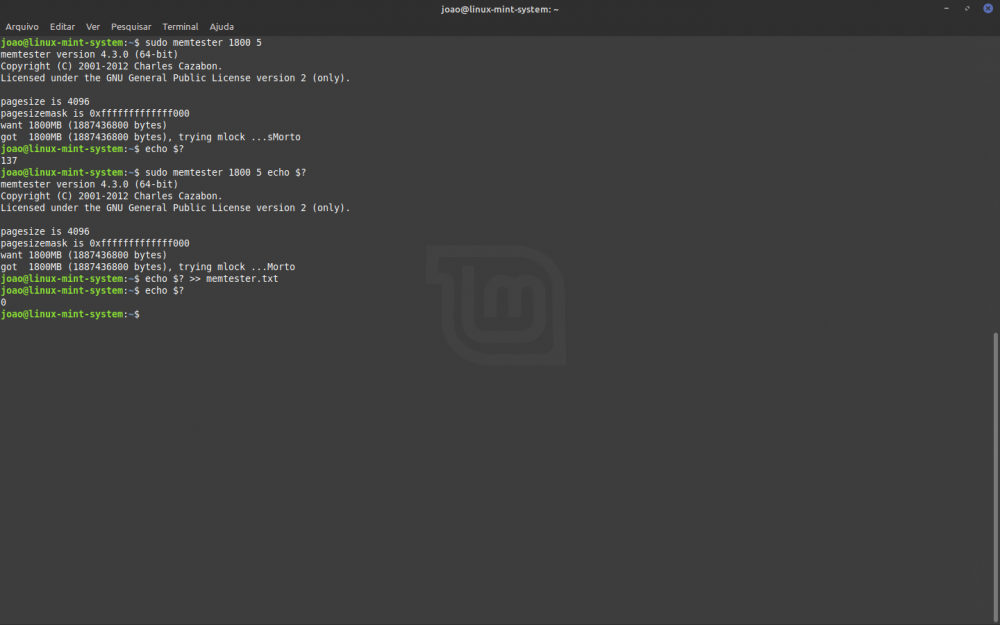 Boa tarde, pessoal. Recentemente fiz um post relatando um linux que apresentava artefatos na tela após algum tempo de uso, geralmente depois de alguma ação como abrir um software. Hoje, rodei alguns testes no sistema, a princípio mais direcionados ao HD, que eu acreditava ser o problema. Em anexo seguem alguns .txt com informações do sistema e de alguns testes realizados, que eu aceitaria alguma ajuda para interpretar os ressultados. Mas, aparentemente tudo está rodando bem. O que mais me chamou atenção foi um resultado de um teste feito pelo memtester do linux que retornou o valor 137 (segue o print em anexo). Você acham que o problema seria a memória? PS: Post editado porque eu tentei escrevê-lo do linux em questão, mas ele bugou bizarramente e enviou o post incompleto hard_disk_log.txt system-log.txt