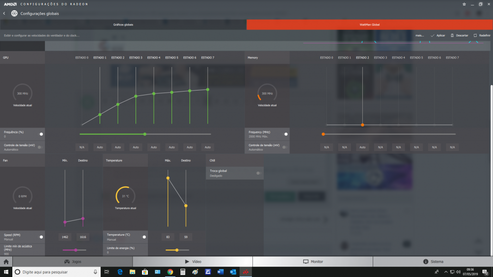 3. Prezados boa noite. Estou com problema na placa gráfica Gigabite RX 580-8G-252b-ddr5, a temperatura não passa de 25º e os fans ativam constantemente gerando um barulho desagradável, já reinstalei o drive, atualizei chip set, fiz limpeza apesar de ser nova etc...Temperatura do processador padrão. Acabaram minhas alternativa, Ajuda ae! Abraaço. Versão do software Radeon - 17.1.1 Edição do software Radeon - Crimson ReLive Chipset gráfico - Radeon RX 580 Series Tamanho da memória - 8192 MB Tipo de memória - GDDR5 Clock interno - 1340 MHz Versão do Windows - Windows 10 (64 bit) Memória do sistema - 16 GB Tipo da CPU - Intel(R) Core(TM) i7-2600 CPU @ 3.40GHz
