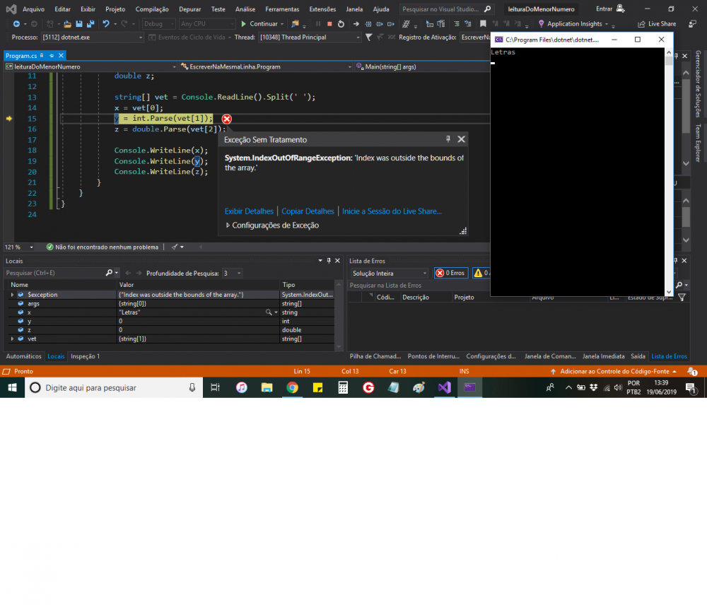 Bom dia a todos. Eu comecei a aprender C# ontem e para testar meus conhecimentos iniciais estou fazendo alguns testes do URI JUDGE. Eu não consegui resolver dois problemas iniciais (1010 e 1012) porque a entrada de dados não deve ser feita em linhas separadas e sim na mesma linha com um espaço entre elas. Eu pesquisei bastante como fazer isso e encontrei em vários locais, mas quando eu implemento retorna um erro: System.IndexOutOfRangeException: 'Index was outside the bounds of the array.' A FORMA COMO ENCONTREI PARA SE IMPLEMENTAR A ENTRADA DE DADOS NA MESMA LINHA: usando string[] e split(' '). using System; namespace EscreverNaMesmaLinha { class Program { static void Main(string[] args) { string x; int y; double z; string[] vet = Console.ReadLine().Split(' '); x = vet[0]; y = int.Parse(vet[1]); z = double.Parse(vet[2]); Console.WriteLine(x); Console.WriteLine(y); Console.WriteLine(z); } } } Infelizmente essa forma acima não está funcionando. Talvez esteja desatualizada, não sei. Vocês poderiam me ajudar? Segue o link dos dois problemas propostos no site do URI JUDGE. Problema 1010: https://www.urionlinejudge.com.br/judge/pt/problems/view/1010 Problema 1012: https://www.urionlinejudge.com.br/judge/pt/problems/view/1012 Obrigado a todos que se disporem em me ajudar e me desculpem por qualquer erro.