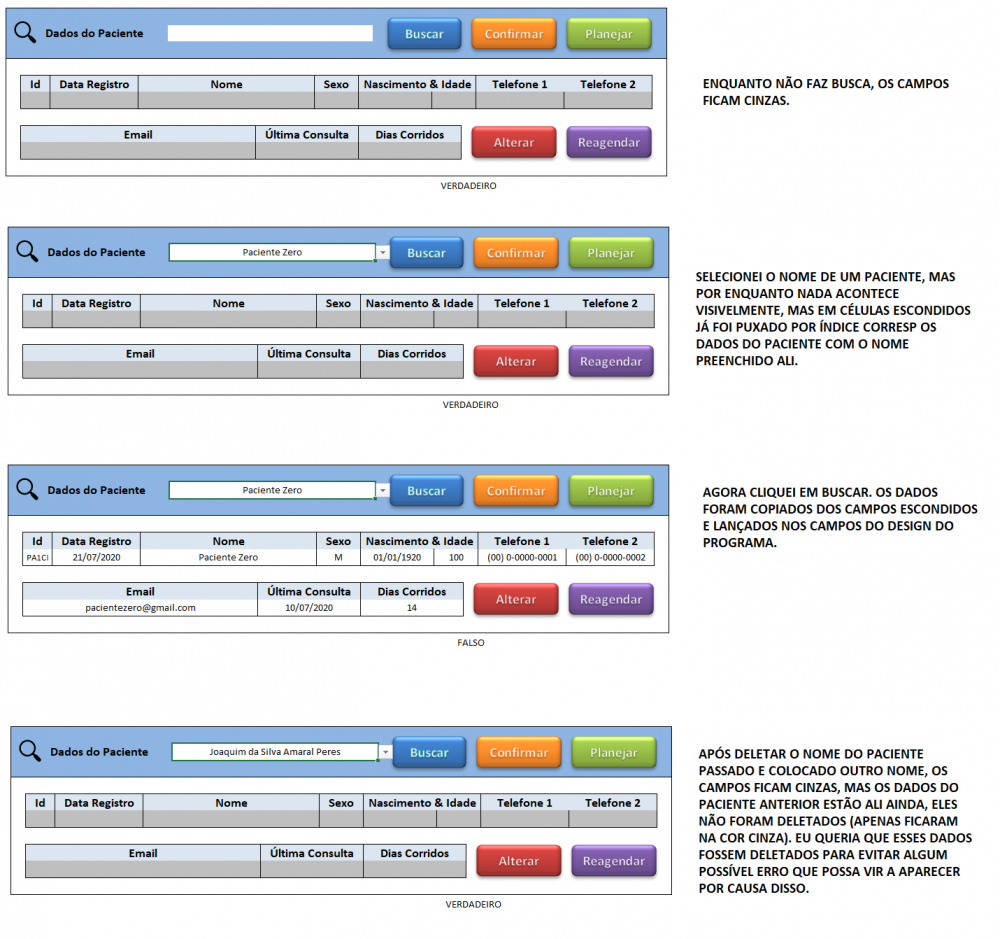 @Midori Infelizmente não deu certo. Fecha meu excel. Não dá nenhum erro, mas na hora que o código roda, o excel fecha. Não sei o motivo, mas apenas fecha sozinho. Mas tudo bem, se não der certo não tem problema. Era só algo que eu queria fazer por perfeccionismo meu mesmo. MUITÍSSIMO OBRIGADO pela sua disposição de tempo em me ajudar. Eu vou te explicar melhor o meu caso, pois talvez você consiga me ajudar de outra forma. Tenho uma lista de validação de dados. Quando eu seleciono algum nome da lista, em alguns campos escondidos são puxadas as informações desse nome. Quando eu clico no botão buscar, essas informações desses campos escondidos são copiadas para outros campos do design da planilha. Até aqui, ok. Mas quando eu deleto o nome lá da lista de validação de dados ou seleciono outro nome, enquanto eu não clico em buscar novamente, ficam os dados antigos que foram copiados. Minha intenção em fazer aquilo que pedi ajuda no tópico era para que assim que tal célula ficasse verdadeira, esses dados fossem limpados para que quando eu colocasse outro nome da lista de validação de dados, na parte do programa, as células estivessem em branco. Seguem todos para ilustrar melhor. -