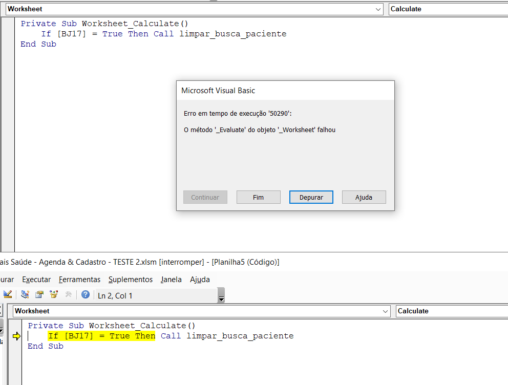 @Midori Colei o código, como você passou, mas deu erro (segue imagem em anexo). Aí, após o erro da imagem, eu olhei o código e pensei que talvez seria porque não tinha End If e coloquei. Por fim, parece que o código roda, mas parece que enquanto o valor da célula é VERDADEIRO, o código fica rodando loucamente sem parar e trava o excel. Ele travou o excel imediatamente (nem pude conferir se rodou mesmo a macro). Porque essa macro que eu quero rodar é o seguinte: se a célula for verdadeiro, rode a macro de limpar alguns campos da planilha. Aí acho que ele está fazendo isso sem parar. O código que eu coloquei com o End If: ***MUDEI A CÉLULA BJ17 PARA BD17, mas por questões pessoais mesmo. Private Sub Worksheet_Calculate() If [BD17] = True Then Call limpar_busca_paciente End If End Sub -