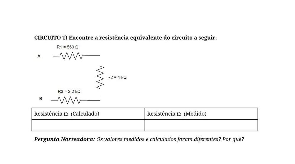 @.if , foi eu que respondi essas atividades, porém não tenho certeza se estão corretas. Será que a resposta dessa " pergunta norteadora" da primeira atividade estaria certa? Nessa segunda atividade ( circuito 2), entendi , então poderia arredondar 222.97Ω para 223Ω. Mas não usei ohmímetro, foi multímetro. Se a resistência equivalente calculada é igual a 222.97 Ω e no multímetro deu 223Ω, isso significa que ele,(multímetro), já arredondou para 223Ω? Agora falando da "pergunta norteadora" da segunda atividade(circuito 2), não entendi o que essa questão pede. Você saberia? -