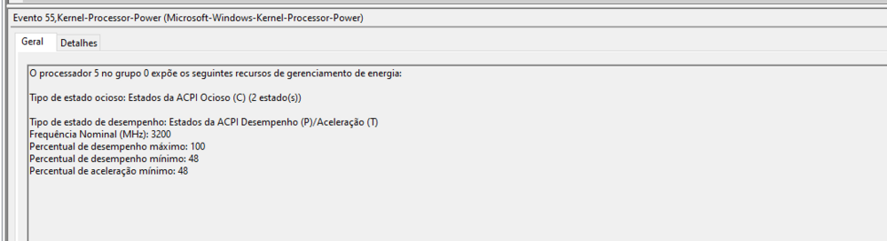 CONFIG: placa-mãe: AB350M-DS3H V2 Placa de vídeo: Nvidia GTX 1660 Processador: AMD Ryzen 5 1600 Six-Core Processor 3.20 GHz Fonte: Gigabyte B700H Memórias: 2 pentes 8 GB cada, XPG Tuf Gaming Alliance Descrição do problema: O computador desliga aleatoriamente, as vezes demora 1h, as vezes 15 minutos, as vezes 3h e assim em diante Essas foram algumas das minhas tentativas para tentar solucionar porém até agora sem resultado: 1° Formatação 2° Tirar e limpei as memórias e os slots 3° Mudei as memórias nos canais que estavam, e também testei colocando em canais diferentes 1 3 e 2 e 4 4° Deixei os drivers mais atualizados da placa de vídeo 5° testei com Perfil XPM ativo e desativado 6° Visualizei a temperatura de ambos ( processador e placa de vídeo ) através do HW monitor e não chegaram próximo de temperaturas que possam preocupar Processador máximo que vi: entre 55 a 60° (95 max fabricante ) e a placa 65 - 74 ( 93 max fabricante ) 7° Mantive Windows Update atualizado ultima versão ETC 8° utilizei também o DDU para uma limpeza de drivers 9° Mudei opção de energia do Windows para alto desempenho, tentei as outras opções também 10° utilizei drivers antigos da GPU Algumas observações: Ao instalar drivers antigos, as vezes o pc ficava mais tempo ligado do que com o driver mais recente Recentemente após o pc desligar, eu tenho entrado no modo de segurança, rodado o DDU e depois colocado uma versão diferente de driver, n a mais recente e com isso a frequência de quedas tem diminuído bastante até E tem sido dessa forma que eu tenho levado até o momento Esse é o feedback que o visualizador do Windows tem me dado quando desliga: É isso que tenho conhecimento até o momento, e realmente não tenho muito conhecimento para saber o que é exatamente.