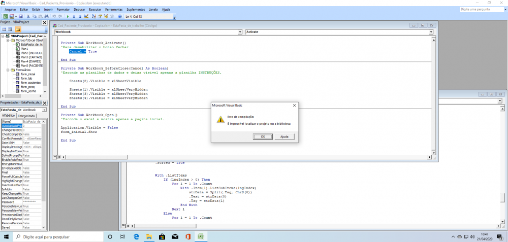 Sou tecnico de enfermagem e me aventurei na programacao vba porque estava cansado da desorganizacao no meu servico e resolvi criar uma ferramenta para facilitar o trabalho. Agora o ps foi trocado e comecou a apresentar problemas. Não sou experiente em VBA, sou do tipo que apenas segue tutos. Estou tentando achar o erro mas não encontro. parece que tem mais de um problema. Tamberm vou postar algumas imagens. Ha tb ja tentei retirar a bibliotecas ausentes e nao funcionou. Estou postando meu projeto VBA. O objetivo dele é fazer uma lista de nomes com numeros de prontuarios para pacientes, junto com outras informações relevantes. O PC anterior tinha WIN 7 e Office 2007 32bit. Atualmente conta com WIn10 64bit e Office nao sei qual é. mas nos testes em uma VM estou usando 2007 32bits e os problemas continuam. Gostaria da ajuda se possivel. Desde ja Agradeço. Cad_Paciente_Provisorio.rar