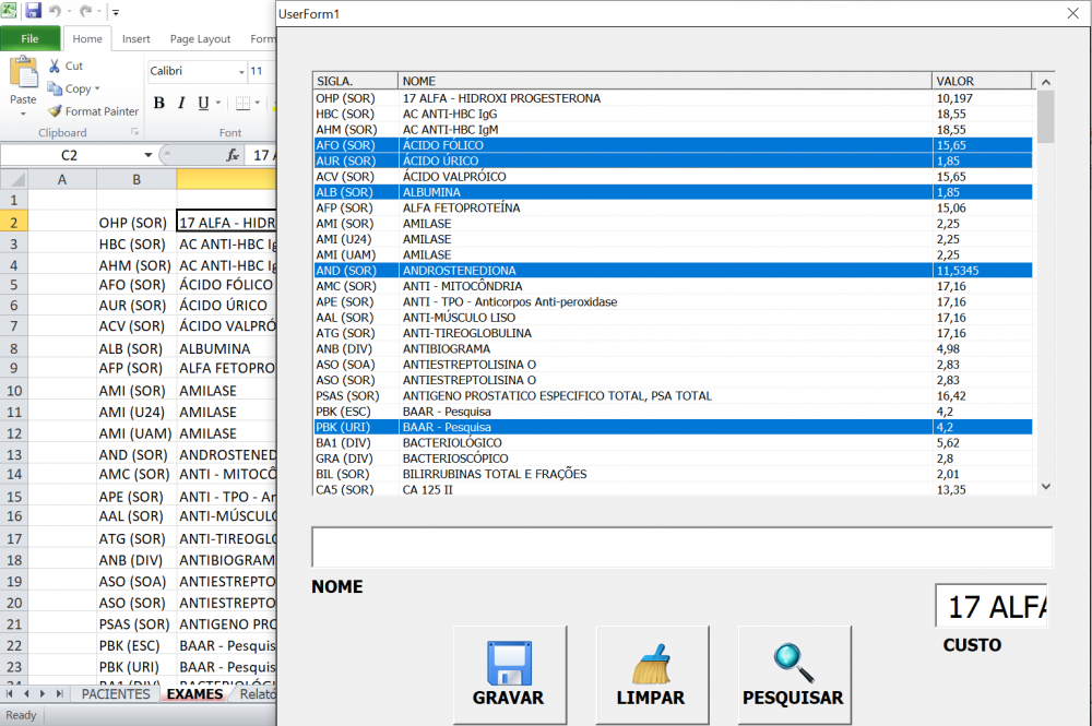 Gostaria que me ajudassem como fazer o codigo para somar os itens selecionados de forma que a soma dos valores fosse para um listbox ou textbox, pois quero gravar o nome da pessoa e o valor da soma dos exames em outra planilha onde depois eu vou fazer um relatorio mensal de quanto foi gasto. pensei se desse pra fazer a selecao dos itens conforme a imagem abaixo . mas nao consigo sair daqui. meu codigo ta uma bagunca que nem eu me acho mais o que realmente ta funcionando ou nao. o codigo vai abaixo: Option Explicit Private Sub UserForm_Initialize() Call Tags 'Call CarItens 'Call SomarItens 'Call CarItSoma End Sub Private Sub Tags() With ListView1 .Gridlines = True .View = lvwReport .FullRowSelect = True .MultiSelect = True .ColumnHeaders.Add Text:="SIGLA", Width:=85, Alignment:=0 .ColumnHeaders.Add Text:="NOME", Width:=350, Alignment:=0 .ColumnHeaders.Add Text:="VALOR", Width:=70, Alignment:=2 End With End Sub Private Sub CarItSoma() Dim lin As Integer Dim li As Variant ListView1.ListItems.Clear Sheets("EXAMES").Select lin = 5 Do Until Sheets("EXAMES").Cells(lin, 2) = "" Set li = ListView1.ListItems.Add(Text:=Sheets("EXAMES").Cells(lin, 2).Value) li.ListSubItems.Add Text:=Sheets("EXAMES").Cells(lin, 3).Value li.ListSubItems.Add Text:=Sheets("EXAMES").Cells(lin, 4).Value lin = lin + 1 Loop Dim Soma As Double For i = 1 To ListView1.ListItems.Count Soma = Soma + ListView1.ListItems.Item(i).SubItems(2) Next i TextSoma = Soma End Sub Private Sub CarItens() Dim linha, linhalist As Integer Dim Ultimalinha, Lista As Variant linhalist = 0 linha = 5 ListView1.ListItems.Clear Plan3.Select With Plan3 While Cells(linha, 2).Value <> "" Ultimalinha = .Cells(Rows.Count, "b").End(xlUp).Row With ListView1 Set Lista = ListView1.ListItems.Add(Text:=Cells(linha, "b").Value) Lista.ListSubItems.Add Text:=Cells(linha, "c").Value Lista.ListSubItems.Add Text:=Cells(linha, "d").Value End With linhalist = linhalist + 1 linha = linha + 1 Wend End With End Sub Sub SomarItens() 'Soma itens selecionados no formulario Dim Linhas As Integer Dim Soma As Double With Form_lab Linhas = .ListView1.ListItems.Count For i = 5 To Linhas If .ListView1.ListItems(i).Selected = True Then Soma = Soma + .ListView1.ListItems(i).ListSubItems(2) 'Valor End If Next .lblSoma.Caption = Format(Soma, "Currency") 'TextSoma.Value = ListView1.ListItems(lin).SubItems(2) End With End Sub Private Sub BtnLabPesqPact_Click() 'Abre o formulario de pesquisa dde pacientes. Unload Form_lab form_pesq.Show End Sub