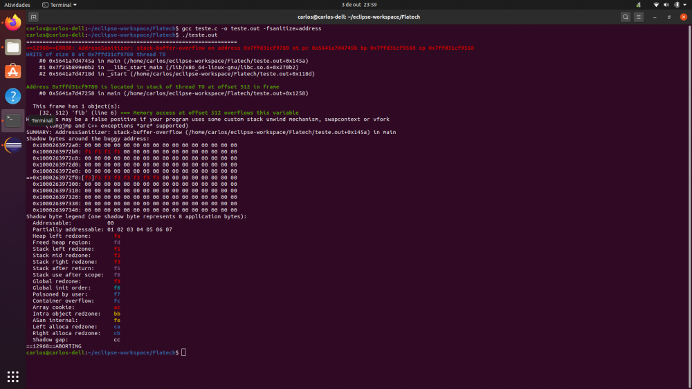 25. Percebi. O terminal da mais acesso e controle do compilador. Agradeço a atenção, meu amigo. Vocês foram feras em me apoiar. Fiquei a tarde inteira pesquisando, e não consegui delimitar o problema até postar aqui no fórum e vocês me auxiliarem. Vou atrás desses livros. Obrigado mais um vez, @KXSY! adicionado 12 minutos depois E só pra dar um retorno pra vocês, este sanitize realmente foi direto no problema, o tamanho da variável que declarei o vetor. Obrigado, pessoal!