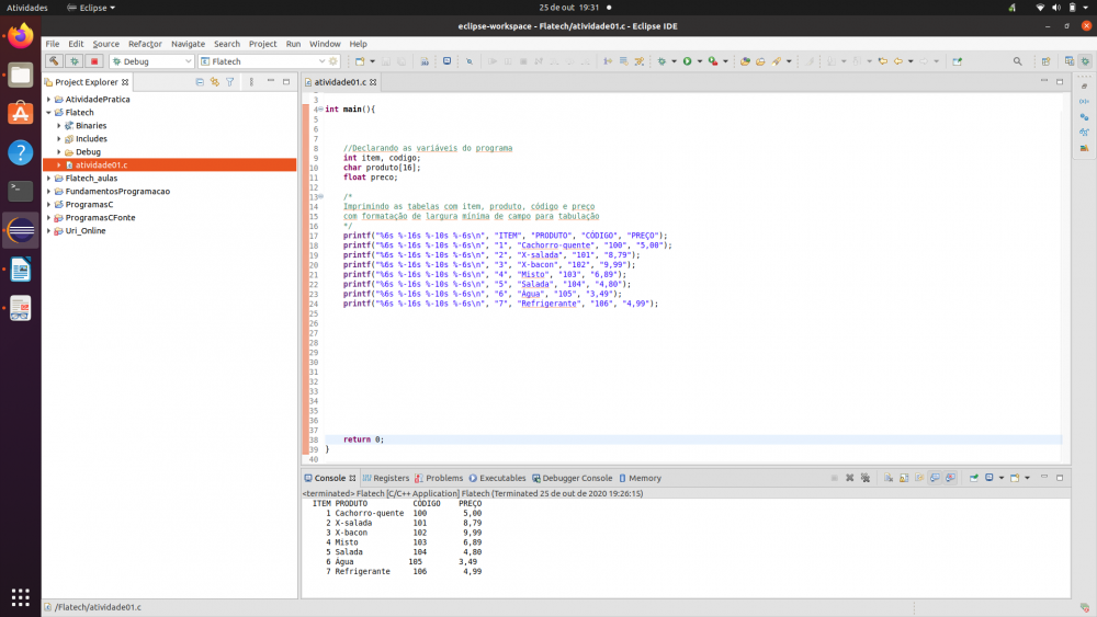 14. @KXSY obrigado pelas dicas, meu amigo. Já salvei aqui pra ler com calma depois. Mas a minha dúvida é outra. Eu utilizei a formatação de limite de campos para a impressão do printf. Porém, o mesmo código manteve o alinhamento no sistema Windows, como mostrou nosso amigo @devair1010. Já no Linux, a impressão que envolvia a palavra "Água", não manteve o alinhamento, como nas demais linhas. Sobre a impressão correta dos caracteres, eu entendi como faz. A minha dúvida é se o carácter especial, por exemplo aqueles que levam acento, são ocupados de maneira diferente na string. E acabei de ver aqui pelo debug do Eclipse que o que eu suspeitava é isso mesmo. A palavra "Água" ocupa 5 espaços. Mas de qualquer forma, este artigo da USP me será muito útil. Obrigado pela atenção. O outro assunto que você me encaminhou acho que ainda é muito avançado. Obrigado mesmo assim!