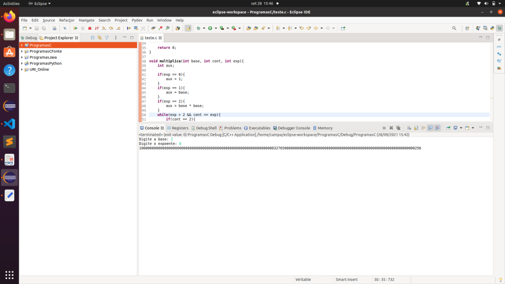 7. Pessoal, boa tarde. Estou iniciando meus estudos em C, e estou com algumas questões pra praticar, juntamente com questões propostas pela faculdade. Eles deram o seguinte problema: "Faça, em linguagem C, uma função recursiva para o cálculo potenciação. Sabe-se que o cálculo pode ser feito através de multiplicações sucessivas. Para demonstrar o funcionamento utilize o primeiro digito do seu RU como base e o último digito como expoente." Fiz um código aqui, mas não estou entendendo a saída dele. #include <stdio.h> void multiplica(int base, int cont, int exp); int main(){ int base, expoente; printf("Digite a base: "); scanf("%d", &base); printf("Digite o expoente: "); scanf("%d", &expoente); multiplica(base, 2, expoente); #include <stdio.h> void multiplica(int base, int cont, int exp); int main(){ int base, expoente; printf("Digite a base: "); scanf("%d", &base); printf("Digite o expoente: "); scanf("%d", &expoente); multiplica(base, 2, expoente); return 0; } void multiplica(int base, int cont, int exp){ int aux; if(exp == 0){ aux = 1; } if(exp == 1){ aux = base; } if(exp == 2){ aux = base * base; } while(exp > 2 && cont <= exp){ if(cont == 2){ aux = base * base; cont++; multiplica(aux, cont, exp); } else{ aux = aux * base; cont++; multiplica(aux, cont, exp); } } printf("%d", aux); } return 0; } void multiplica(int base, int cont, int exp){ int aux; if(exp == 0){ aux = 1; } if(exp == 1){ aux = base; } if(exp == 2){ aux = base * base; } while(exp > 2 && cont <= exp){ if(cont == 2){ aux = base * base; cont++; multiplica(aux, cont, exp); } else{ aux = aux * base; cont++; multiplica(aux, cont, exp); } } printf("%d", aux); } Ele está apresentando a seguinte saída, anexada na postagem. Alguém poderia me dar um auxílio?