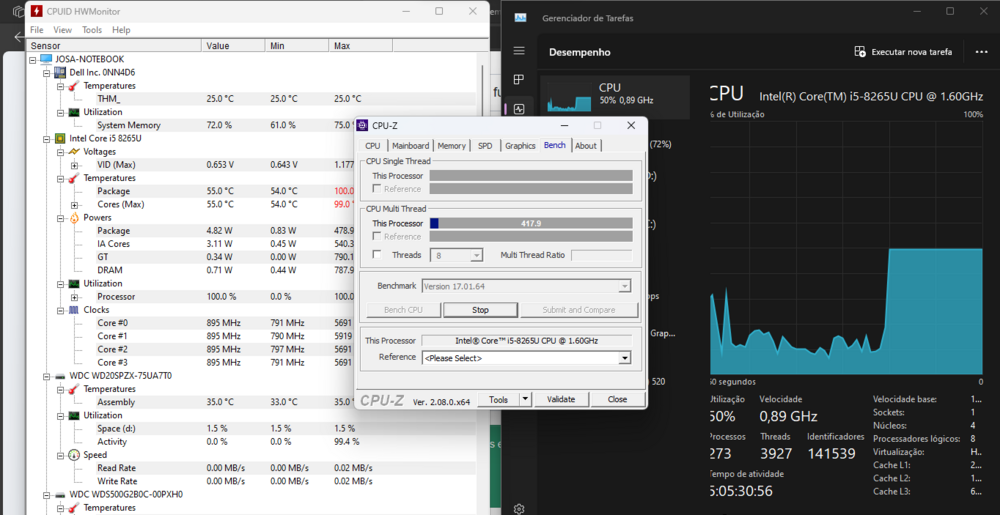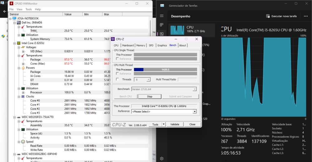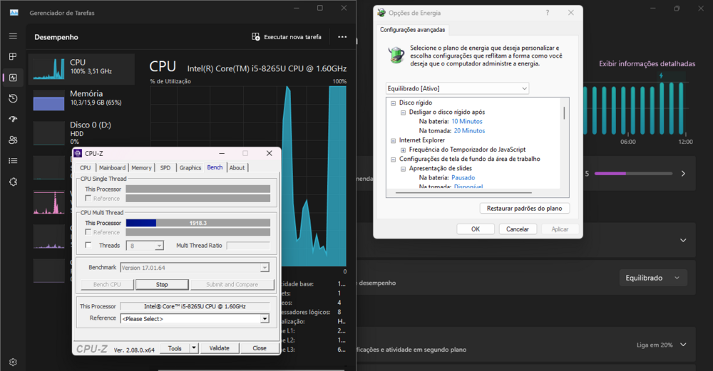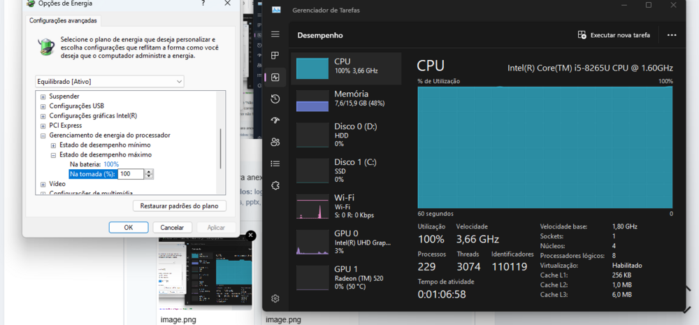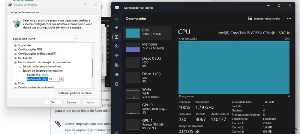 Olá, pessoal. Antes de tudo, para fazer as medições, estou utilizando o HWMonitor e o próprio Gerenciador de Tarefas, bem como o CPU-Z para estressar processador. Tentarei descrever tudo por aqui que fiz para resolver o meu problema, para que se eu tiver cometido algum erro e alguém perceber, que me fale para que eu possa resolver o problema. Uso a 4 anos um Notebook Dell Inspiron 3583, com Processador Intel(R) Core(TM) i5-8265U CPU @ 1.60GHz 1.80 GHz - se for necessário mais informações, eu mando. Seus drivers estão atualizados conforme o aplicativo Dell SupportAssist, e ele foi recentemente formatado. O motivo que estou mandando essa pergunta é que ele está com uma temperatura muito próxima de 100°C quando o utilizo mais sua capacidade (não precisa nem estar a 100% de uso de CPU segundo o Gerenciador de Tarefas, mas em meus testes não ultrapassa 100°C mesmo a 100% de uso). E o problema é que ele está muito próximo de sua temperatura máxima de 100°C conforme site da Intel (https://www.intel.com/content/www/us/en/products/sku/149088/intel-core-i58265u-processor-6m-cache-up-to-3-90-GHz/specifications.html). Houve vezes no passado que ele ele estava em uma temperatura muito alta realizando umas coisas do meu trabalho e, depois, quando fui conferir ele, ele estava desligado, acredito que por causa da temperatura. Por causa disso, eu tenho receio que ele vá dá problemas se continuar assim. O Notebook está devidamente limpo, com uma pasta em tese boa trocada semana passada. Queria nesse caso poder fazer a limitação de uso do CPU para que force menos dele, para que ele fique em temperaturas um pouco mais baixas. Ao mesmo tempo, não queria simplesmente deixar no Modo de Energia "Equilibrado" o modo de energia porque, pelo que vi no Gerenciador de Tarefas aqui, fica na metade da performance pelo menos, mas a temperatura fica bem baixa para os padrões daqui, em torno de 56°C. Por isso, queria poder fazer um controle mais fino, e a forma que encontrei de fazer isso foi pelo Gerenciamento de Energia do Processador, limitando um pouco, mas mantendo o Modo de Energia "Melhor Desempenho". Para fazer isso, estou alterando a configuração de Opções de Energia no Painel de Controle conforme ilustrado na Figura 1. Figura 1: alterando gerenciamento de energia do processador Eu consigo perceber um problema na minha abordagem, estou alterando a configuração de energia "Equilibrado", esperando que seja alterado o Modo de Energia "Melhor Desempenho", mas como tentei ilustrar, é essa a única opção que consigo ver para alterar. Como esperado, isso não funcionou para limitar o "Melhor Desempenho", conforme ilustra Figura 2, apenas para limitar o "Equilibrado", na Figura 3. Figura 2: "Melhor Desempenho" limitado a 50% de uso Figura 3: "Equilibrado" limitado a 50% de uso Na primeira figura, é possível ver que a temperatura está meio alarmante, e que o uso de CPU não está limitado em termos de Utilização conforme Gerenciador de Tarefas, já na segunda, a utilização bate no máximo 50%, como eu tinha configurado. A única alternativa para meu problema que consegui perceber foi transformar "Equilibrado" em "Desempenho Máximo", já que não sei como alterar as Opções de Energia do Desempenho Máximo. Para isso, deixei tudo no topo de desempenho em Opções de Energia, e consegui alterar conforme Figura 4. Figura 4: transformação de "Equilibrado" em "Desempenho Máximo" Acreditei que tinha resolvido, mas quando coloco para diminuir o uso do processador pelo Gerenciamento de Energia do Processador, para uns 90% por exemplo, a velocidade do processador baixa para o estado anterior de "Equilibrado". Posso colocar para diminuir apenas 1% que não faz diferença, o uso cai para algo em torno de 1.80 GHz. Alguém tem alguma sugestão do que eu possa fazer? Observações: Ainda busquei a algum tempo formas de aumentar a velocidade da ventoinha, mas não consegui. Não lembro dos programas que encontrei, só sei que não funcionaram, a não ser o Dell Power Manager (https://www.dell.com/support/contents/en-us/article/product-support/self-support-knowledgebase/software-and-downloads/dell-power-manager), que até altera a velocidade da ventoinha, mas não permite um ajuste fino, que é o que busco, mas sim só uma escolha entre 4 opções que não me agradam. O técnico que levei falou que o sistema de resfriamento desse notebook não presta muito.