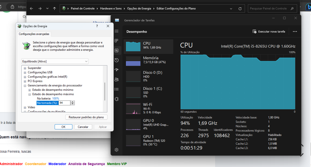 Opa @J. Flavio Melo, valeu aí por responder. Rapaz, eu já tinha visto sobre os coolers, mas nunca tinha testado e nem lido muito sobre. Fui ler, e o que pude ver de comentários em sites de compras é q eles não fazem milagres. Aí tentei fazer um teste equivalente, que não sei se foi muito justo com as bases coolers, mas eu testei com um ventilador por baixo do negócio, não que dê para usar normalmente, é mais só para poder conferir se resfria em uso máximo. Para testar, botei o CPU-Z para estressar o processador e não consegui ver diferença de temperatura significativa (continua em temperaturas altas, de certeza não resfriou nem 5°C infelizmente), talvez justamente pelo sistema de resfriamento de meu notebook ser meio *****, e talvez por eu morar no nordeste, e o vento ser mais quente. Opa @F4b10, valeu aí pelo seu conhecimento nessa bronca. No caso, o que estava acontecendo, e não sei se por desconhecimento meu ou que eu não vi direito, é que a velocidade do processador, quando eu colocava para estressar o notebook era que a velocidade ficava em torno de 1.80 GHz, não se ajustava com o tempo, só ficava nisso mesmo. Não sei se eu fiz alguma modificação muito grande em Opções de energia, mas em "Equilibrado", quando limito para 94% por exemplo o uso, fica em 1.69 GHz como ilustra a figura abaixo. Com relação ao comentário que "Não tem jeito", eu não entendi muito bem, no caso o que eu estou tentando alterar aqui não corresponde a limitação de uso ou é algum outro "Não" que para o que estou tentando fazer não funciona? No caso, 99% ficar no limite de 1.80 GHz enquanto que deixar nos 100% a velocidade sobe para >3.66 GHz é um bug no meu notebook ou é uma limitação do funcionamento dos PCs mesmo? Não consigo limitar para ser 90% da velocidade máxima com o clock? -