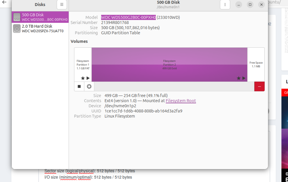 Opa @opuss. Não está mais na garantia, mas vou levar para o pessoal ver depois, vou só procurar o que pode ser um pouquinho mais. Obrigado. Opa @tchagas . Obrigado pelo seu tempo. Usando o Xorg deu bronca tb. Nem consigo replicar o erro porque acontece em momentos aleatórios. É em tela de login, é quando estou usando coisas mais pesadas, quando ele só está ligado... No caso é um NVMe, WDC WDS500G2B0C-00PXH0. Vou testar aqui e na próxima mensagem já falo Essa foi a saída do comando q você falou: Disk /dev/loop0: 63.75 MiB, 66842624 bytes, 130552 sectors Units: sectors of 1 * 512 = 512 bytes Sector size (logical/physical): 512 bytes / 512 bytes I/O size (minimum/optimal): 512 bytes / 512 bytes Disk /dev/loop1: 4 KiB, 4096 bytes, 8 sectors Units: sectors of 1 * 512 = 512 bytes Sector size (logical/physical): 512 bytes / 512 bytes I/O size (minimum/optimal): 512 bytes / 512 bytes Disk /dev/loop2: 63.75 MiB, 66850816 bytes, 130568 sectors Units: sectors of 1 * 512 = 512 bytes Sector size (logical/physical): 512 bytes / 512 bytes I/O size (minimum/optimal): 512 bytes / 512 bytes Disk /dev/loop3: 73.88 MiB, 77471744 bytes, 151312 sectors Units: sectors of 1 * 512 = 512 bytes Sector size (logical/physical): 512 bytes / 512 bytes I/O size (minimum/optimal): 512 bytes / 512 bytes Disk /dev/loop4: 73.89 MiB, 77475840 bytes, 151320 sectors Units: sectors of 1 * 512 = 512 bytes Sector size (logical/physical): 512 bytes / 512 bytes I/O size (minimum/optimal): 512 bytes / 512 bytes Disk /dev/loop5: 66.22 MiB, 69439488 bytes, 135624 sectors Units: sectors of 1 * 512 = 512 bytes Sector size (logical/physical): 512 bytes / 512 bytes I/O size (minimum/optimal): 512 bytes / 512 bytes Disk /dev/loop6: 66.76 MiB, 70004736 bytes, 136728 sectors Units: sectors of 1 * 512 = 512 bytes Sector size (logical/physical): 512 bytes / 512 bytes I/O size (minimum/optimal): 512 bytes / 512 bytes Disk /dev/loop7: 242 MiB, 253755392 bytes, 495616 sectors Units: sectors of 1 * 512 = 512 bytes Sector size (logical/physical): 512 bytes / 512 bytes I/O size (minimum/optimal): 512 bytes / 512 bytes Disk /dev/sda: 1.82 TiB, 2000398934016 bytes, 3907029168 sectors Disk model: WDC WD20SPZX-75U Units: sectors of 1 * 512 = 512 bytes Sector size (logical/physical): 512 bytes / 4096 bytes I/O size (minimum/optimal): 4096 bytes / 4096 bytes Disklabel type: gpt Disk identifier: C9EB8DB3-BCC8-426E-84EA-8F63686BDDF2 Device Start End Sectors Size Type /dev/sda1 2048 34815 32768 16M Microsoft reserved /dev/sda2 34816 3907028991 3906994176 1.8T Microsoft basic data Disk /dev/nvme0n1: 465.76 GiB, 500107862016 bytes, 976773168 sectors Disk model: WDC WDS500G2B0C-00PXH0 Units: sectors of 1 * 512 = 512 bytes Sector size (logical/physical): 512 bytes / 512 bytes I/O size (minimum/optimal): 512 bytes / 512 bytes Disklabel type: gpt Disk identifier: AA1BDA71-F355-4790-8F36-DF458FCD948C Device Start End Sectors Size Type /dev/nvme0n1p1 2048 2203647 2201600 1G EFI System /dev/nvme0n1p2 2203648 976771071 974567424 464.7G Linux filesystem Disk /dev/loop8: 242 MiB, 253751296 bytes, 495608 sectors Units: sectors of 1 * 512 = 512 bytes Sector size (logical/physical): 512 bytes / 512 bytes I/O size (minimum/optimal): 512 bytes / 512 bytes Disk /dev/loop9: 11.13 MiB, 11673600 bytes, 22800 sectors Units: sectors of 1 * 512 = 512 bytes Sector size (logical/physical): 512 bytes / 512 bytes I/O size (minimum/optimal): 512 bytes / 512 bytes Disk /dev/loop10: 192.98 MiB, 202350592 bytes, 395216 sectors Units: sectors of 1 * 512 = 512 bytes Sector size (logical/physical): 512 bytes / 512 bytes I/O size (minimum/optimal): 512 bytes / 512 bytes Disk /dev/loop11: 349.7 MiB, 366682112 bytes, 716176 sectors Units: sectors of 1 * 512 = 512 bytes Sector size (logical/physical): 512 bytes / 512 bytes I/O size (minimum/optimal): 512 bytes / 512 bytes Disk /dev/loop12: 516.01 MiB, 541073408 bytes, 1056784 sectors Units: sectors of 1 * 512 = 512 bytes Sector size (logical/physical): 512 bytes / 512 bytes I/O size (minimum/optimal): 512 bytes / 512 bytes Disk /dev/loop14: 91.69 MiB, 96141312 bytes, 187776 sectors Units: sectors of 1 * 512 = 512 bytes Sector size (logical/physical): 512 bytes / 512 bytes I/O size (minimum/optimal): 512 bytes / 512 bytes Disk /dev/loop13: 404.38 MiB, 424017920 bytes, 828160 sectors Units: sectors of 1 * 512 = 512 bytes Sector size (logical/physical): 512 bytes / 512 bytes I/O size (minimum/optimal): 512 bytes / 512 bytes Disk /dev/loop15: 1.3 GiB, 1400619008 bytes, 2735584 sectors Units: sectors of 1 * 512 = 512 bytes Sector size (logical/physical): 512 bytes / 512 bytes I/O size (minimum/optimal): 512 bytes / 512 bytes Disk /dev/loop16: 1.3 GiB, 1400619008 bytes, 2735584 sectors Units: sectors of 1 * 512 = 512 bytes Sector size (logical/physical): 512 bytes / 512 bytes I/O size (minimum/optimal): 512 bytes / 512 bytes Disk /dev/loop17: 6.38 MiB, 6684672 bytes, 13056 sectors Units: sectors of 1 * 512 = 512 bytes Sector size (logical/physical): 512 bytes / 512 bytes I/O size (minimum/optimal): 512 bytes / 512 bytes Disk /dev/loop18: 6.38 MiB, 6684672 bytes, 13056 sectors Units: sectors of 1 * 512 = 512 bytes Sector size (logical/physical): 512 bytes / 512 bytes I/O size (minimum/optimal): 512 bytes / 512 bytes Disk /dev/loop19: 17.13 MiB, 17965056 bytes, 35088 sectors Units: sectors of 1 * 512 = 512 bytes Sector size (logical/physical): 512 bytes / 512 bytes I/O size (minimum/optimal): 512 bytes / 512 bytes Disk /dev/loop20: 207.39 MiB, 217464832 bytes, 424736 sectors Units: sectors of 1 * 512 = 512 bytes Sector size (logical/physical): 512 bytes / 512 bytes I/O size (minimum/optimal): 512 bytes / 512 bytes Disk /dev/loop21: 70.04 MiB, 73437184 bytes, 143432 sectors Units: sectors of 1 * 512 = 512 bytes Sector size (logical/physical): 512 bytes / 512 bytes I/O size (minimum/optimal): 512 bytes / 512 bytes Disk /dev/loop22: 126.37 MiB, 132509696 bytes, 258808 sectors Units: sectors of 1 * 512 = 512 bytes Sector size (logical/physical)