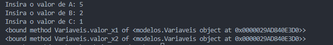 Boa noite, estou tentando imprimir o resultado de uma função, porém me retorna o seguinte resultado <bound method Variaveis.valor_x1 of <modelos.Variaveis object at 0x0000029AD840E3D0>> # Deve calcular uma equação do segundo grau from modelos import Variaveis variaveis = Variaveis() # Atribui os valores das variaveis variaveis.a = int(input("Insira o valor de A: ")) variaveis.b = int(input("Insira o valor de B: ")) variaveis.c = int(input("Insira o valor de C: ")) print(variaveis.valor_x1) print(variaveis.valor_x2) import math class Variaveis: @property def a(self): return self.__a @a.setter def a(self, a): self.__a = a @property def b(self): return self.__b @b.setter def b(self, b): self.__b = b @property def c(self): return self.__c @c.setter def c(self, c): self.__c = c # Aqui vai calcular o delta def __delta(self): delta = pow(self.__b, 2) - 4 * self.__a * self.__c; return delta # Calcula o x1 da equação def valor_x1(self): delta = math.sqrt(self.__delta) return ((-1 * (self.__b)) - delta) / 2 * self.__a; # Calcula o x2 da equação def valor_x2(self): delta = math.sqrt(self.__delta) return ((-1 * (self.__b)) - delta) / 2 * self.__a;