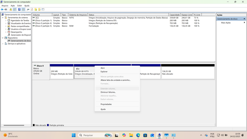 1. diminui partiçao mais não consigo estender de volta Windows não permite como estende de volta essa *****? não consigo de jeito nem um