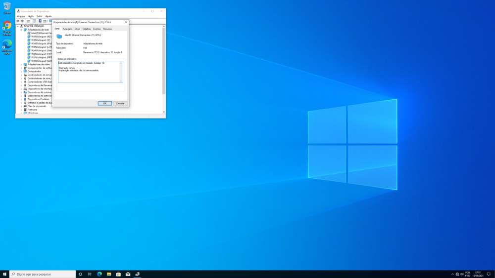 8. Ola, boa noite pessoal. Acabei de montar e instalar o Windows numa maquina com peças novas e estou com um problema no adaptador de Rede. Já fiz atualização de BIOS, formatei de novo, tentei instalar drivers diretamente do site da intel (baixei em outro pc e coloquei em um pendrive), mas continua dando esse erro: O dispositivo não pode ser inicial (Codigo 10). Alguem já passou por isso? É um problema da placa-mãe e devo entrar em contato para pedir a troca ou tem alguma solução? Desde já, agradeço!!