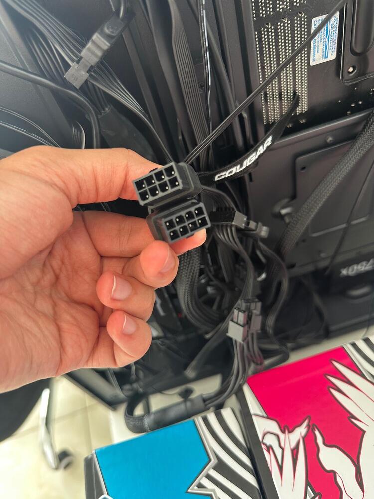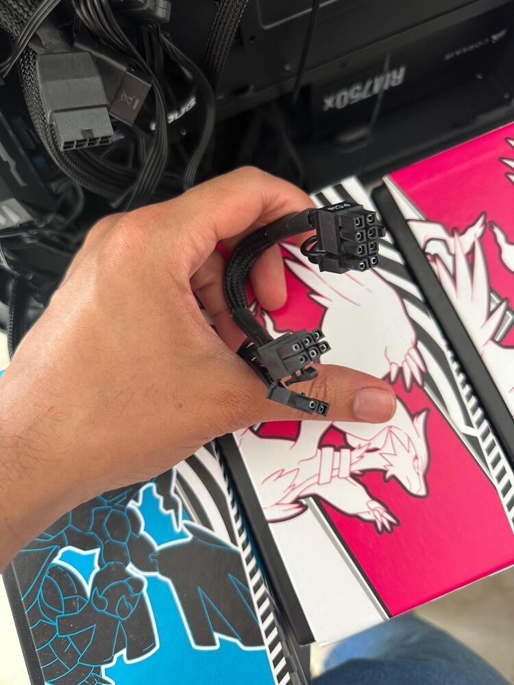 7. @Tiberio @Tiberio Esses são os cabos que estou usando na placa de vídeo. Estou utilizando apenas um cabo. A primeira imagem mostra o cabo PCIe da fonte e a outra é o conector da placa de vídeo. Vou verificar se pode ser mau contato apertando melhor os cabos, mas também estou desconfiando da placa-mãe. Alguém tem algum conselho sobre a troca? @NascaYT eu estava conferindo a temperatura estava abaixo de 80c