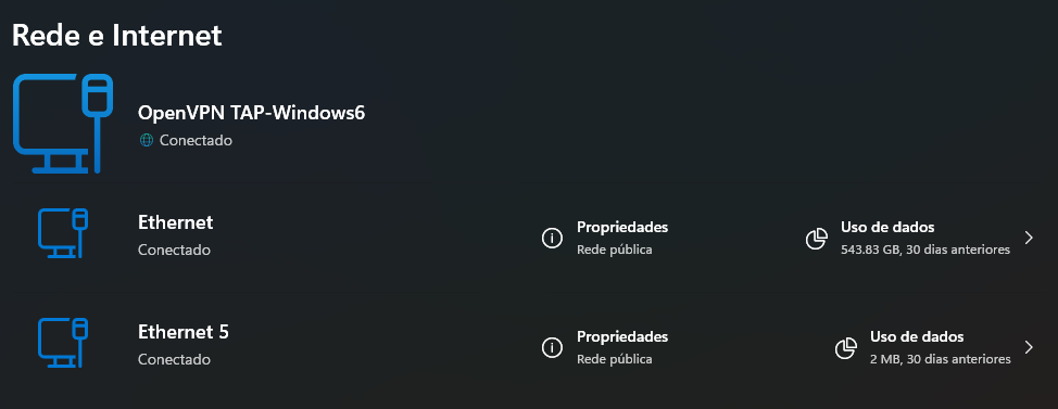 Boa Noite, Utilizo o Software Aster para `` separar `` meu computador em dois. Eu precisaria utilizar a rede com VPN (OpenVPN Gui) para trabalho, no meu usuário. E no usuário da minha esposa eu precisaria usar a internet hasteada do celular via cabo USB. Tem alguma maneira para fazer essa separação? Ethernet 5 é pelo cel, Tethering UBS