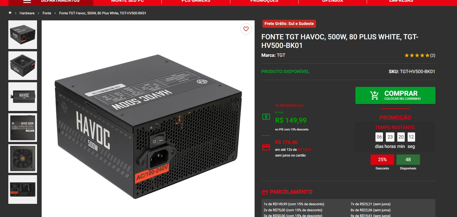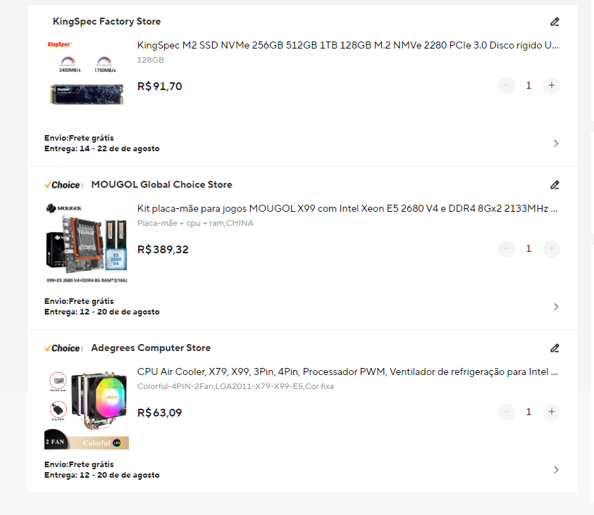 @ArturHW Bom Dia Amigo, A GPU Realmente é só para uso bem básico mesmo, literalmente só para dar o vídeo. Segue links: https://pt.aliexpress.com/item/1005008660476048.html?spm=a2g0o.productlist.main.3.3f181ad5PBSh1b&algo_pvid=229831e0-f1e6-49a9-a060-55e5e4ffcac0&algo_exp_id=229831e0-f1e6-49a9-a060-55e5e4ffcac0-2&pdp_ext_f={"order"%3A"5591"%2C"eval"%3A"1"%2C"orig_sl_item_id"%3A"1005008660476048"%2C"orig_item_id"%3A"1005007437482486"}&pdp_npi=4%40dis!BRL!523.06!214.38!!!615.00!252.06!%402101ead817543133791377988ef955!12000046135795965!sea!BR!0!ABX&curPageLogUid=1hV9k4iRdFXi&utparam-url=scene%3Asearch|query_from%3A https://pt.aliexpress.com/item/32847169083.html?spm=a2g0o.cart.0.0.4bbd7f06cRxIaZ&mp=1&pdp_npi=5%40dis!BRL!BRL 150.32!BRL 91.70!!BRL 91.70!!!%402103201917543134586797085eb795!12000047440276835!ct!BR!4368711018!!1!0&gatewayAdapt=glo2bra https://www.pichau.com.br/fonte-tgt-havoc-500w-80-plus-white-tgt-hv500-bk01?gad_source=1&gad_campaignid=20186139285&gbraid=0AAAAADvAK90kDharA5QrSumLwvNT7P8pz&gclid=Cj0KCQjwtMHEBhC-ARIsABua5iR751W366J9Xjs6vPF-uK8lTl1fK-yRCfZnrKOB6V2JeDauaSxEkP4aAhvXEALw_wcB A fonte eu realmente não conheço marcas mais baratas que sejam confiáveis, se puder me indicar agradeço muito @1lokos Bom Dia Amigo, Show de bola, muito obrigado pelas dicas, o CPU cooler vou pegar este que você recomendou, preço dele é ótimo. @Herbet Queiroz Bom Dia amigo, Que Bacana, bom saber, vi comentários positivos e negativos também, mas no Ali tem muitas vendas, mais de 1500 recomendações e nota 4,9, a principio parece ser bom.
