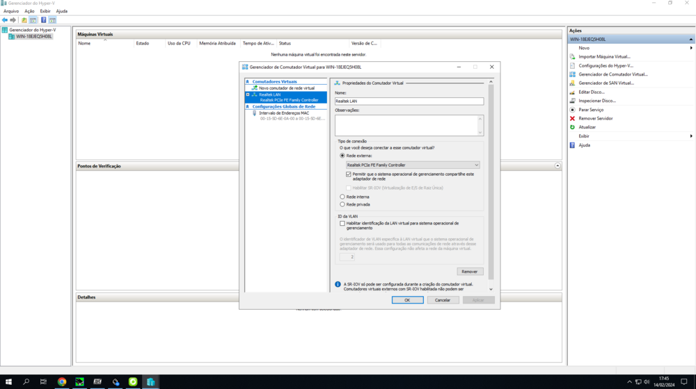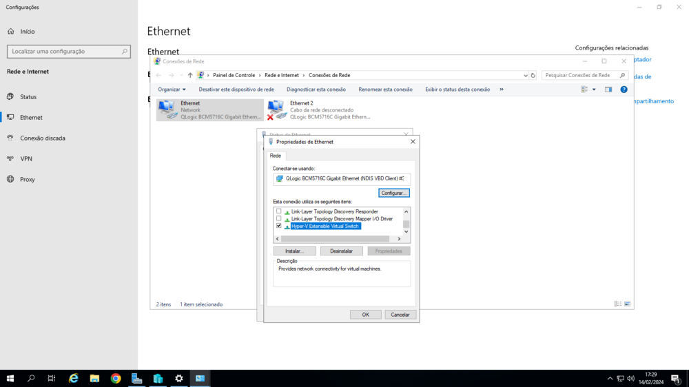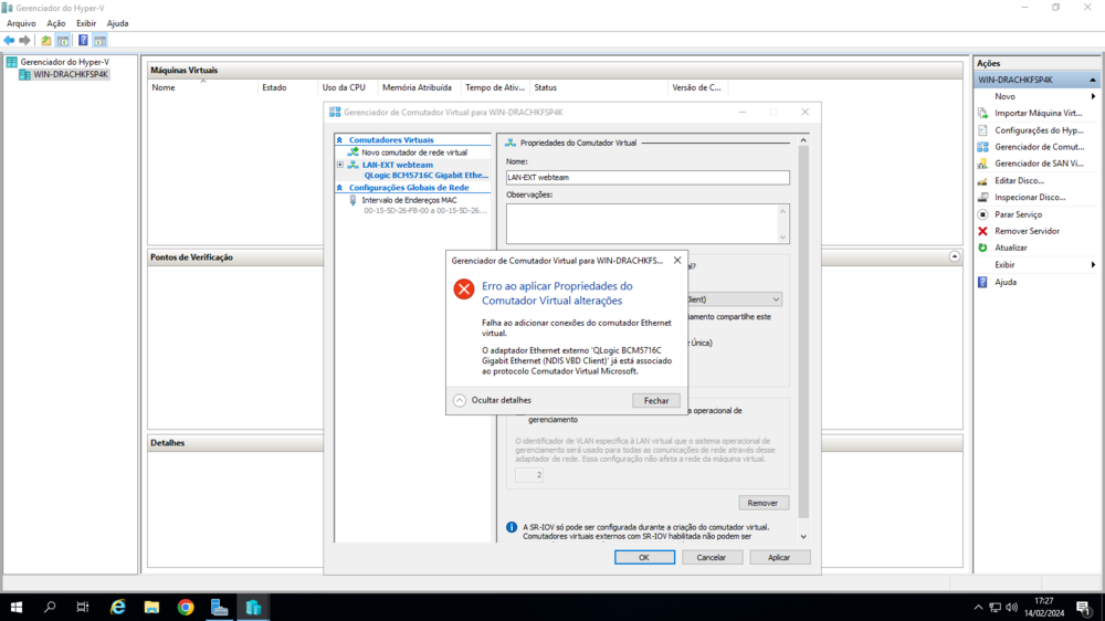 10. Boa noite!!! Estou tentando criar um comutador virtual no Hyper-v e aparece essa mensagem de erro: Erro ao aplicar propriedades do comutador virtual alterações falha ao adicionar conexões do comutador ethernet virtual O adaptador externo "QLOGIC bcm5716c Gigabit Ethernet (NDIS VBD Client)' já esta associado ao protocolo comutador virtual Microsoft. Segue anexo print das telas do sistema..