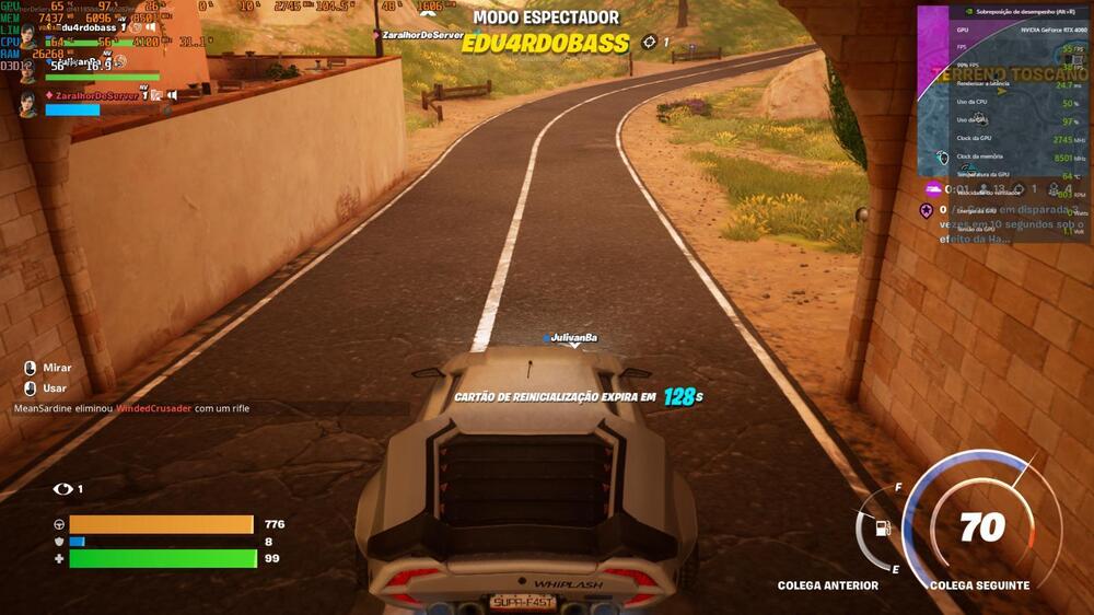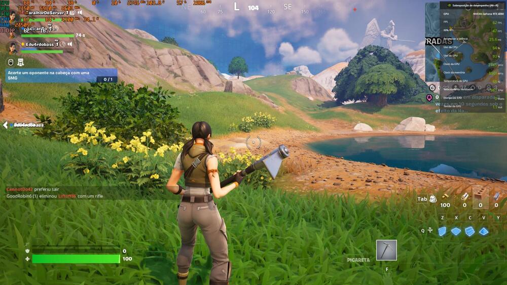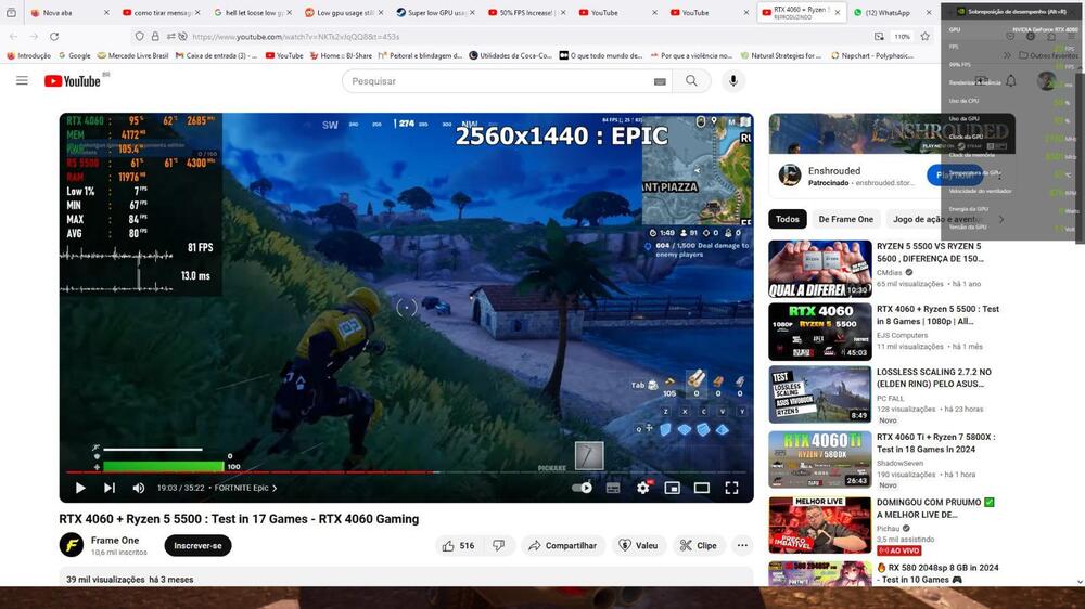 Ano passado comprei uma RTX 4060 modelo gigabyte Eagle de 3 Fans. Eu jogava mais Dayz até agora, e sempre reparei ela operar de maneira estranha, as vezes com fps cravado em 60 e baixo uso dela, as vezes miseros 30%. Mais Dayz é mais bug que jogo então achei que era culpa dele. Mas fui jogar Hell Let lose e além do uso baixo o fps fica na casa dos 50-60. Achei estranho e fui pesquisar sobre. } Achei esse Vídeo, em que usam a 4060 com o mesmo processador que eu, um Ryzen 5 5500. E notei a grande diferença de performasse. Minha config: GPU: RTX 4060 Gigabyte Eagle CPU: Ryzen 5500 Até aqui igual do Vídeo. Mãe: Aorus Elite B550M memória: 2x8GB 2666hz overclocada para 3200hz. Armazenamento: SSD 500gb nvme2. Fonte: Cooler Master MWE 650 Bronze V2. Boa placa-mãe, boa fonte. Monitor Odyssey G3 da Samsung. resolução 1980x1080 FULL HD; Segue Print. Baixei o Fotnite e o Warzone só pra testar isso. No Fort, no Vídeo com mesmo processador e gpu, o fps fica na casa dos 80. No meu fica na casa dos 50-60. Enorme diferença, chego a achar que essa placa é adulterada ou tem algum defeito, por isso penso em acionar a garantia. WARZONE: Miseros 52 FPS enquanto que no Vídeo: Ele está jogando a mais de 90. Então siceramente, se niguém aqui me convencer do contrário vou acionar a garantia desse troço. Me venderam gato por lebre. Foi comprada na PICHAU.