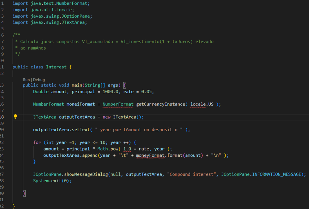 Bom dia, boa tarde ou boa noite pessoal! Comecei a me aventurar na programação em Java há pouco tempo e tenho algumas dúvidas. 1° O código abaixo possui algum erro de sintaxe no início? Estou usando um compilador e ele emite a seguinte mensagem antes de "public class Student": "Student.java is not on the classpath of project myartifactid, only syntax errors are reported". 2° Como eu faço para que na impressão, as médias das notas que seria o "Average" saia com duas casas decimas de precisão? public class Student { String Name; int Registration; String Cpf; String DateOfBirth; double Height; int Age; double Note[] = new double[5]; double Average; String SituationEvidence; public Student(String Name, int Registration, String Cpf, String DateOfBirth, double Height, int Age, double Note1, double Note2, double Note3, double Note4, double Note5) { this.Name = Name; this.Registration = Registration; this.Cpf = Cpf; this.DateOfBirth = DateOfBirth; this.Height = Height; this.Age = Age; this.Note[0] = Note1; this.Note[1] = Note2; this.Note[2] = Note3; this.Note[3] = Note4; this.Note[4] = Note5; CalculateAverage(); } public void SetNote(int Registration, double Note) { if ((Registration < 1) || (Registration > this.Note.length)) return; this.Note[Registration-1] = Note; CalculateAverage(); } public double GetNote(int Registration) { if ((Registration < 1) || (Registration > Note.length)) return 0; return Note[Registration-1]; } private void CalculateAverage() { double Sum = 0; for (int i = 0; i < Note.length; i++) { Sum += Note[i]; } Average = Sum / Note.length; SituationEvidence(); } private void SituationEvidence() { if (Average > 7) { this.SituationEvidence = "Approved!"; } else if (Average > 5) { this.SituationEvidence = "In exam."; } else { this.SituationEvidence = "Disapproved."; } } public String toString() { String out = ""; out += "\nName: " + Name + " \n"; out += "Registration: " + Registration + " \n"; out += "Cpf : " + Cpf + " \n"; out += "Date of birth: " + DateOfBirth + " \n"; out += "Height: " + Height + " \n"; out += "Age: " + Age + " \n"; out += "Average: " + Average + " \n"; out += "Bimonthly situation: " + SituationEvidence + " \n"; return out; } public static void main(String[] args) { Student student[] = new Student[3]; student[0] = new Student("Lucas", 1, "111", "15/05/2001", 1.80, 21, 5.8, 9.2, 4.1, 7.8, 8); student[1] = new Student("Luan", 2, "222", "15/05/2001", 1.79, 21, 9, 9.3, 8, 7, 6); student[2] = new Student("Letícia", 3, "333", "21/10/2002", 1.68, 20, 5, 4, 6, 3, 6.2); for (int i = 0; i < student.length; i++) { System.out.println(student[i]); } } } Desde já, agradeço pela atenção.