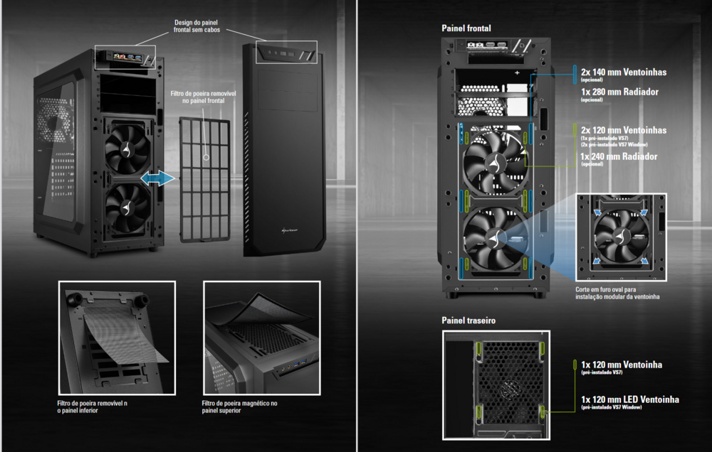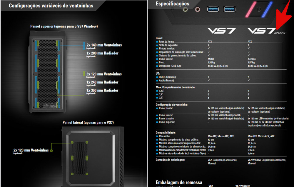 @1lokos Valeu obrigado pela dica, bem como entendi as diferenças em questão. Mas no meu caso não é para gamer e sim para trabalho em Home Office e para um pouco de lazer nos finais de semana. Assim sendo neste caso escolhi o gabinete em questão (Gabinete Sharkoon Mid-ATX VS7 Window USB 3.0 Preto e com 3x 120 mm ventoinha (pré-instaladas) em pesquisas na internet, foi pelo seu custo e benefícios, veja todos os detalhes das informações técnicas no link abaixo no manual do fabricante, bem como algumas imagens no detalhe que por si só se explicam; MANUAL ONLINE Gabinete Sharkoon Mid-ATX VS7 Window -