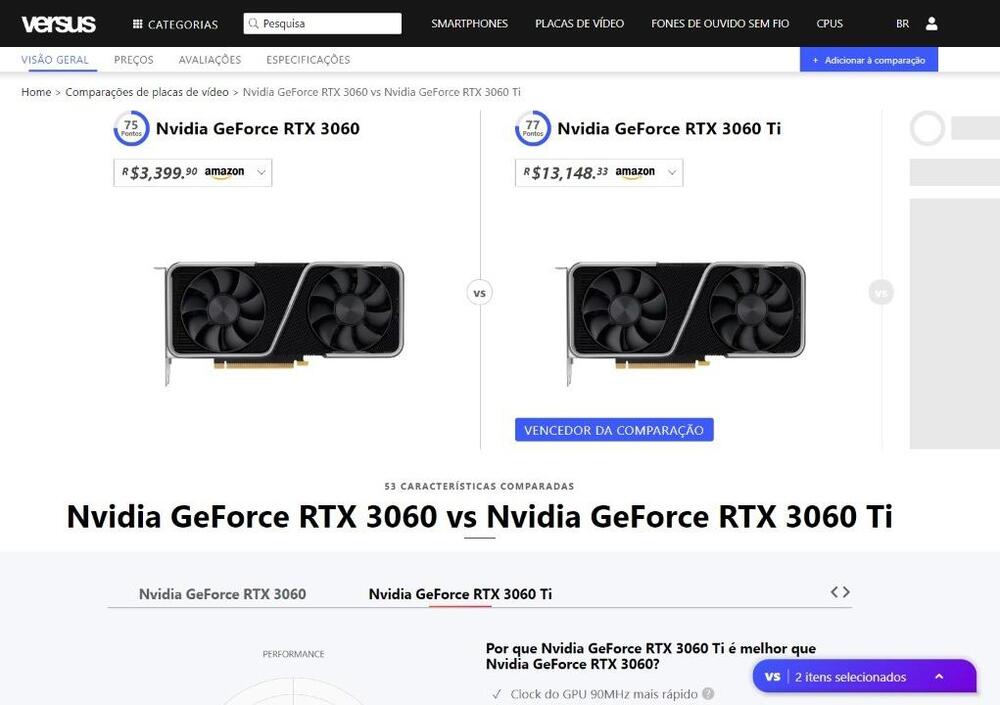 @Fabruxo @Fabruxo Por que Nvidia GeForce RTX 3060 Ti é melhor que Nvidia GeForce RTX 3060? ✔Clock do GPU 90MHz mais rápido? 1410MHzvs1320MHz ✔Desempenho 3.46 TFLOPS maior de ponto flutuante? 16.2 TFLOPSvs12.74 TFLOPS ✔Taxa de píxeis 19.5 GPixel/s maior? 133.2 GPixel/svs113.7 GPixel/s ✔Taxa de textura 54.1 GTexels/s maior? 253.1 GTexels/svs199 GTexels/s ✔88GB/s mais largura de banda de memória? 448GB/svs360GB/s ✔64bit mais ampla largura do barramento? 256bitvs192bit ✔1280 mais unidades de sombreamento? 4864vs3584 ✔4150million mais transistores? 17400 1 milhãovs13250 1 milhão Saiba mais detalhes; https://versus.com/br/nvidia-GeForce-RTX-3060-vs-nvidia-GeForce-RTX-3060-ti
