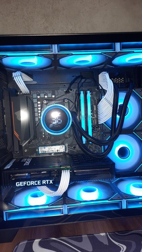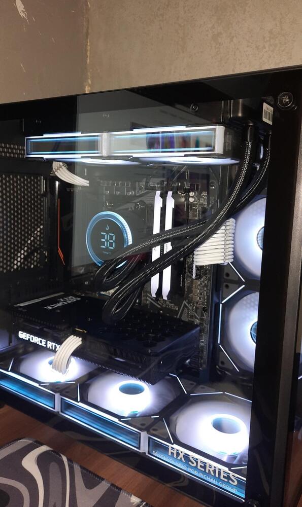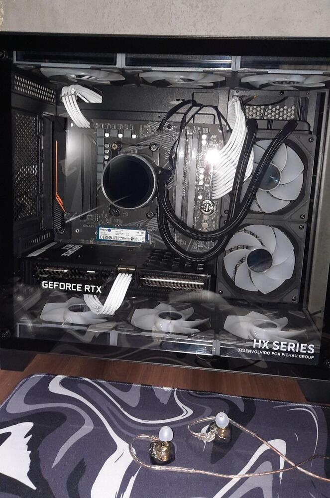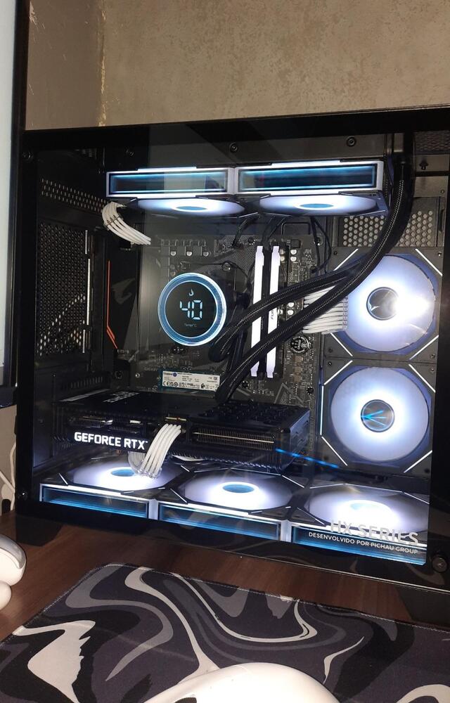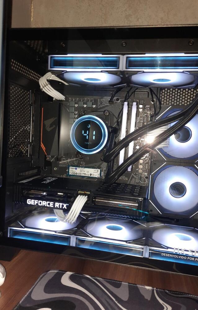 Galera, peço desculpas pela falta de experiência em hardwares e afins. Recentemente, adicionei mais 3 fans no meu PC. Antes, ele tinha três fans embaixo e duas do lado para puxar ar frio para dentro do PC, além de duas no Water Cooler em cima para tirar o ar quente. Meu gabinete é o modelo estilo aquário Pichau HX710L, que só permite a instalação de três fans em cima e apenas um Water Cooler de 240mm. Então, coloquei meu Water Cooler na lateral do gabinete, com as duas fans puxando ar frio para dentro. Também instalei cabos extensores para a placa de vídeo, o cabo de 24 pinos e o cabo da CPU. No entanto, o cabo de 24 pinos está encostando um pouco na mangueira do Water Cooler (vou anexar algumas fotos). Eu costumava deixar o PC no modo silencioso das fans, mas agora estou precisando colocar as fans na rotação máxima para manter o PC frio, pois ele chegou a 90ºC mesmo com 8 fans instaladas. Preciso de ajuda para resolver esse problema, porque acredito que não deveria ser necessário deixar as fans na rotação máxima com 8 fans para resfriá-lo adequadamente. Minhas configurações são: Ryzen 7 5700, uma 3060 de 12GB e 16GB de RAM a 3200MHz. (Usei o GPT para deixar esse texto o mais fácil para vocês entenderem , meu teclado n tem os acentos kkkk)