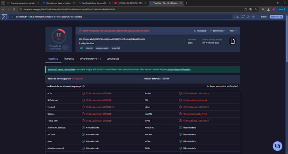@G4R0D ata mn beleza entendi, acho q esse dia nesse horario eu estava colocando m script de ativação de chave do windows 11 pro, mas n parecia ser virus porque eu n tive de instalar nada @Rio McCloud Boa tarde! o link é esse https://www.bing.com/search?q=StartAppWin2.bat StartAppWin2, e subi ao virus total e o resultado foi esse: @Rio McCloud eu não consigo achar no malwarebytes a verificação completa, so tem a rapida e a personalizada