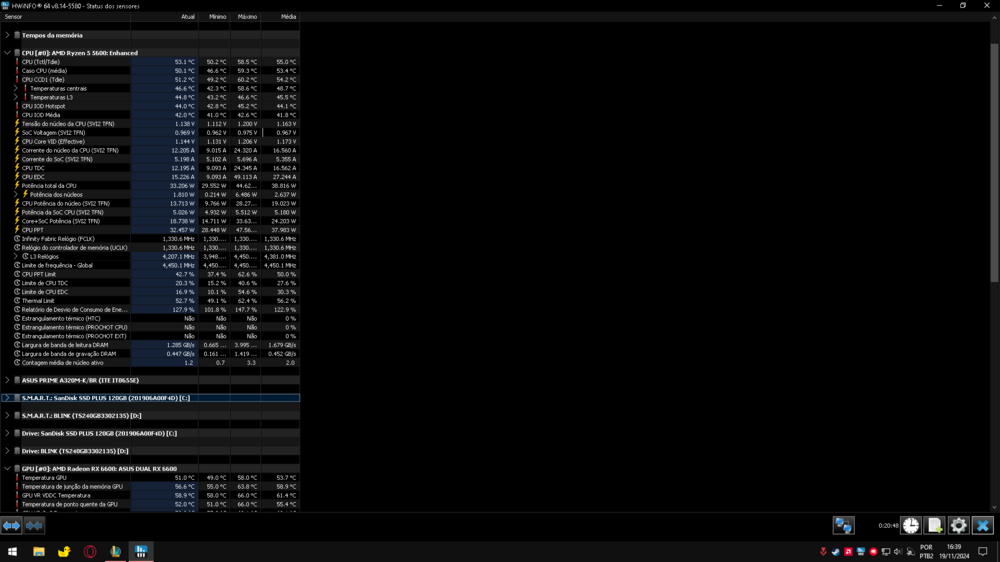 1. Boa tarde, amigos. Esses valores estão normais? Acabei de instalar um R5 5600 numa a320m-k-br, joguei uma partidinha de lol e parece que suportou. Eu queria saber dos senhores se os valores presentes ali no HW estão normais, tanto da cpu e da gpu. Desde já agradeço pela atenção.