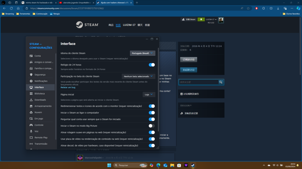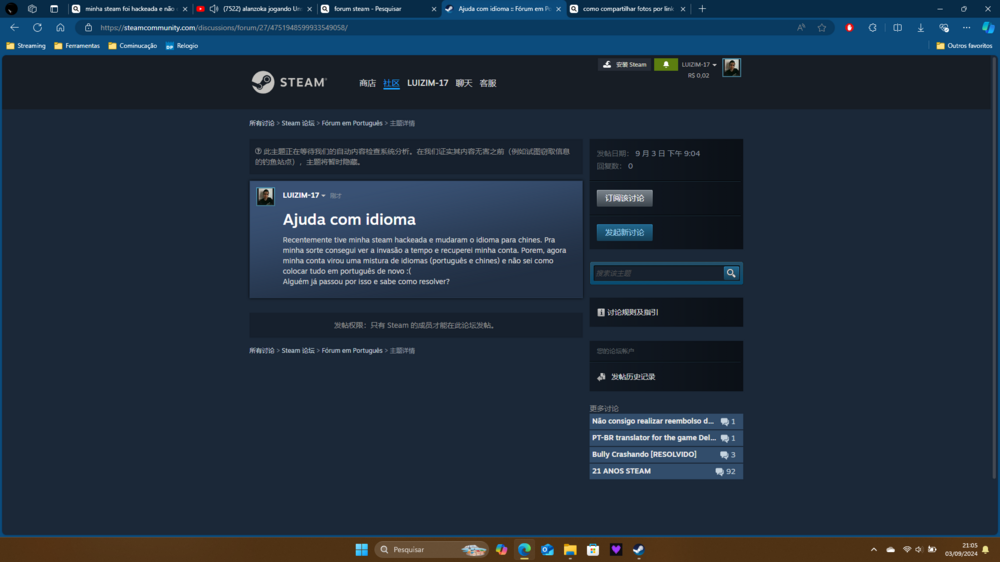 1. Recentemente tive minha steam hackeada e mudaram o idioma para chines. Pra minha sorte consegui ver a invasão a tempo e recuperei minha conta. porém, agora minha conta virou uma mistura dos idiomas português e chines como da pra ver nos prints e não sei como colocar tudo em português de novo Alguém já passou por isso e sabe como resolver?