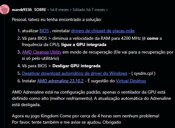 @Joaoa Atualizei a BIOS para a versão mais recente e segundos após ligar e abrir o Chrome, vscode, github desktop aconteceu o problema(vou colocar aqui depois o vídeo mais completo). Achei esse tópico: display_driver_amduw23g_stopped_responding_and Estou testando por cá, você pode fazer o mesmo.. @Joaoa(excetuando o passo do desligar gpu integrada no meu caso) Além disso, também atualizei para o Ruimdows 11 e setei a frequência das memórias para uma fixa(tirei do auto) e fixei em 5200mhz, pois a minha memória Kingston Fury só chega até isso, diferente da TeamGroup de 6000mhz. Até então estou jogando o Phasmo há mais de duas horas e também repeti os passos de abrir os programas assim que ligo o PC e não aconteceu nada... Estou monitorando também a temperatura porque achei que tivesse algo haver mas nitidamente não tem. -