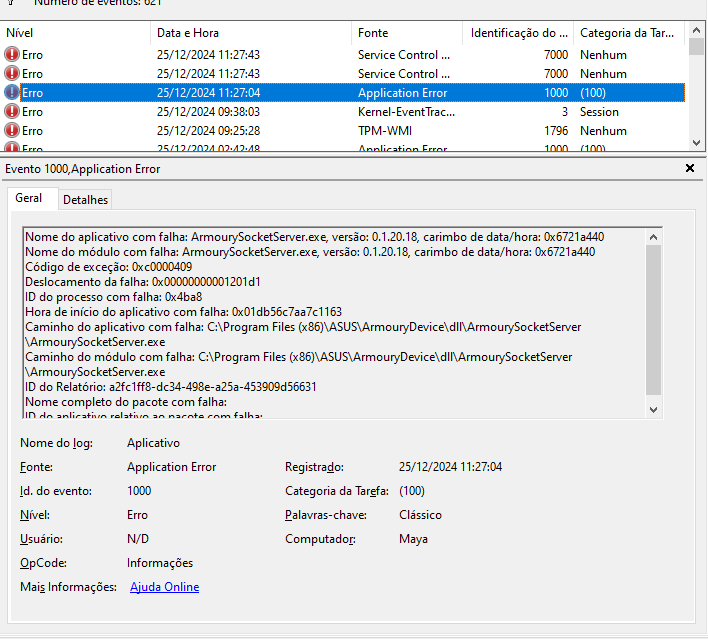 Sim, por aqui o mesmo, acabei de ligar o PC e já tive de cara kkkkkk... Em alguns tópicos as pessoas fazem ligação com o ArmoryCrate e sinalizam ter parado após desinstalar, esse não é o primeiro armoury_socket_server_crashes_apps, outros apontam que ativar o XMP das RAMs corrige o problema, particularmente não sei, vou retirar minha memória Kingston(porque ela não permite o exPO apenas o XMP) e ativar pra ver se isso resolve de alguma forma, se não, vou desinstalar o ArmoryCrate e ver o que ocorre, até porque tem logs dele falhando realmente... -