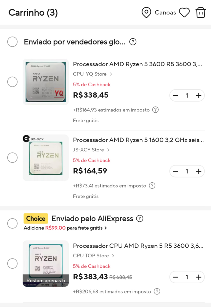 Certo...! Estou impressionada com a complexidade do universo dos processadores. Minha nossa. Achei que as placas de vídeo eram complicadas mas os cpu tem muitos detalhes. XD Agora estou entre o 1600 e o 3600, bem dizendo... Vi relatos e dizem que é um salto bem grande entre eles. E estou considerando o 5500 sim... afinal economizei bastante na rx550... então para a vida útil ser maior seria legal um cpu "bom". SIM. Que taxas horríveis! Separei um de cada para acompanhar os preços na foto em anexo. 1600, 3600 e 5500 -> um dos três possivelmente será o escolhido. Se tiver que att a BIOS, tudo bem. Algum deles é MUITO quente? Sobre os emuladores de ps3/360... ah tudo bem... seria apenas um extra. Rodando os citados anteriormente estou tranquila (e já roda). Gente, obrigada novamente!!!! Se tiverem outros avisos e indicações, estarei a ouvidos!!! -
