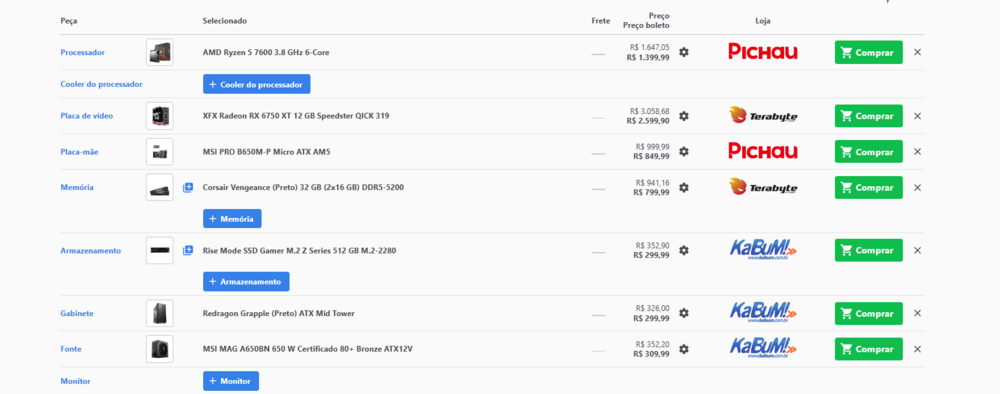 1. Ryzen 7600, b 650p, 32gb, 512gb kingston, GTX 1650 super(vai ser trocada), fonte 650 msi, water cooler de 240mm