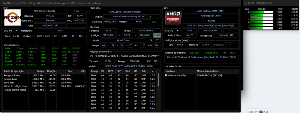 8. Boa tarde rapaziada, cês tão bem? Meu problema e o seguinte Hoje a última peça que faltava para meu Pc chegou, então fui montar ele feliz da vida. Atualizei a BIOS, instalei os drivers tudo certinho Então chegou o momento de ativar o xmp para dar aquela moral para o Pc, assim que ativei e reiniciei o computador fui checar no gerenciador de tarefas e no cpu-z a frequência das memórias e em ambos estava dizendo que elas estavam a 4800 MHz sendo que minhas Memórias são de 5600 MHz Já tentei duas coisas até então que no caso é ativar o xmp e o expo e resetar a BIOS porém nenhum funcionou e já tô sem ideia do que fazer placa-mãe: maxsun b650m challenger memória RAM: 2x Asgard W2 Loki DDR5 5600 MHz Cpu: Ryzen 5 8600g Tentei ver algum jeito de subir a frequência manualmente mas não achei nada muito explicativo então fiquei receoso de tentar Quero muito tentar ativar o xmp pois sem placa de vídeo dedicada que esse processador dependendo muito da frequência das memórias para ter um bom desempenho