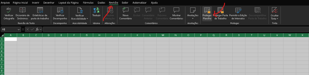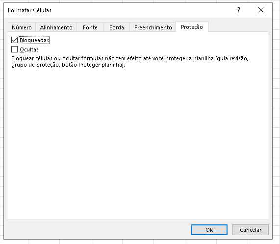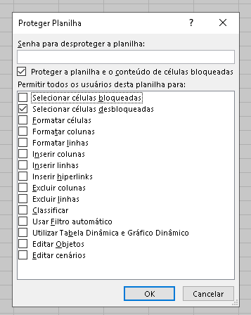 3. 1. Selecionar a tabela inteira clicando no botão marcado abaixo 2. Clicar com o botão direito do mouse e selecionar "Formatar células..." ou usar atalho Ctrl+1 3. Clica na aba Proteção e desmarca a opção "Bloqueadas". Depois clique em OK. 4. Agora é só escolher as células que você quer proteger, selecioná-las e seguir a partir do passo 2 novamente. Só que agora você vai deixar a opção "Bloqueadas" selecionada 5. Depois de bloqueá-las, clicar na aba "Revisão" e clicar no botão "Proteger planilha" 6. Deixar somente a opção abaixo marcada: Pronto! Agora quando o usuário tentar clicar nas células bloqueadas não será mais possível!