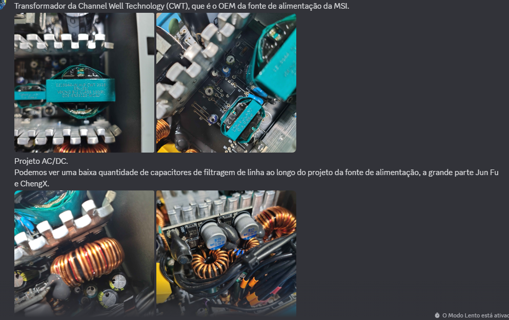 Olá, pessoal! Criei este tópico para informar sobre mais um downgrade identificado na fonte MSI A650BN. Como muitos já sabem, a MSI realizou uma alteração nos componentes dessa fonte em 2023. Na época, um representante da empresa afirmou que o projeto original constava com o capacitor principal sendo Chengx, mas, devido à falta de estoque de capacitores, houve uma substituição temporária por modelos Teapo 105 °C — como confirmado na unidade testada pelo canal Teclab. Posteriormente, a MSI teria retornado ao projeto original. Além disso, algumas unidades chegaram ao mercado com capacitores AsiaX e Capxon na linha principal, variando entre modelos de 105 °C e 85 °C. Essa situação já gerou bastante polêmica na época, mas acabou sendo deixada de lado com o tempo. No entanto, recentes relatos de dois usuários no Discord indicam que uma nova alteração nos capacitores foi realizada, tanto na linha principal quanto na secundária Segue as imagens retiradas do usuário "juansigma" do server Papahardware: Como podem ver, O capacitor principal foi trocado por um Jun Fu 85c TIER 4 (Capacitores de pior qualidade) e os secundários também. TIERLIST DE CAPACITORES Outra denúncia feita pelo usuário "akko_5075" no server GuigaGames: Mesmo capacitor Jun Fu 85c . Como podem ver, essa unidade foi comprada na Kabum! No final de 2024, então já faz pelo menos 10 meses desde a troca de componentes. NF do Akko: Quero deixar isso aqui no fórum como prova de que a MSI falhou, mais uma vez, com os consumidores. Mesmo após toda a polêmica, eles vão lá e cometem mais um erro. E o pior: agora, ao invés de uma troca equivalente por outro Tier 3, eles colocaram um Jun Fu Tier 4! Espero que essa denúncia chegue aos representantes da MSI Brasil. Vamos ver que tipo de pronunciamento eles vão fazer dessa vez.- 2 respostas